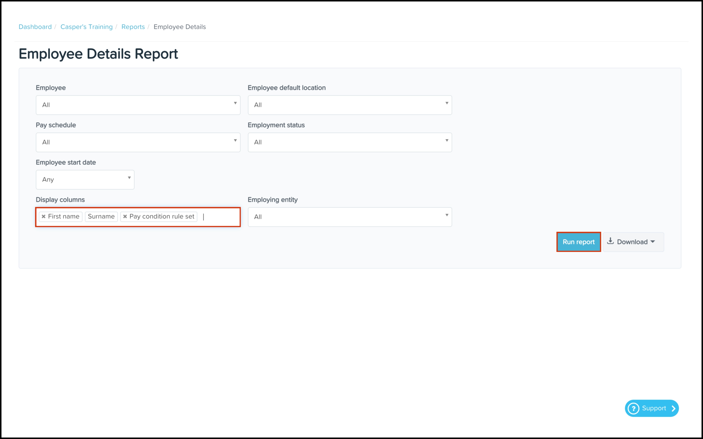 You can use the Employee Details Reporting feature to construct a report on the pay condition rule sets assigned to your employees within your payroll platform.
