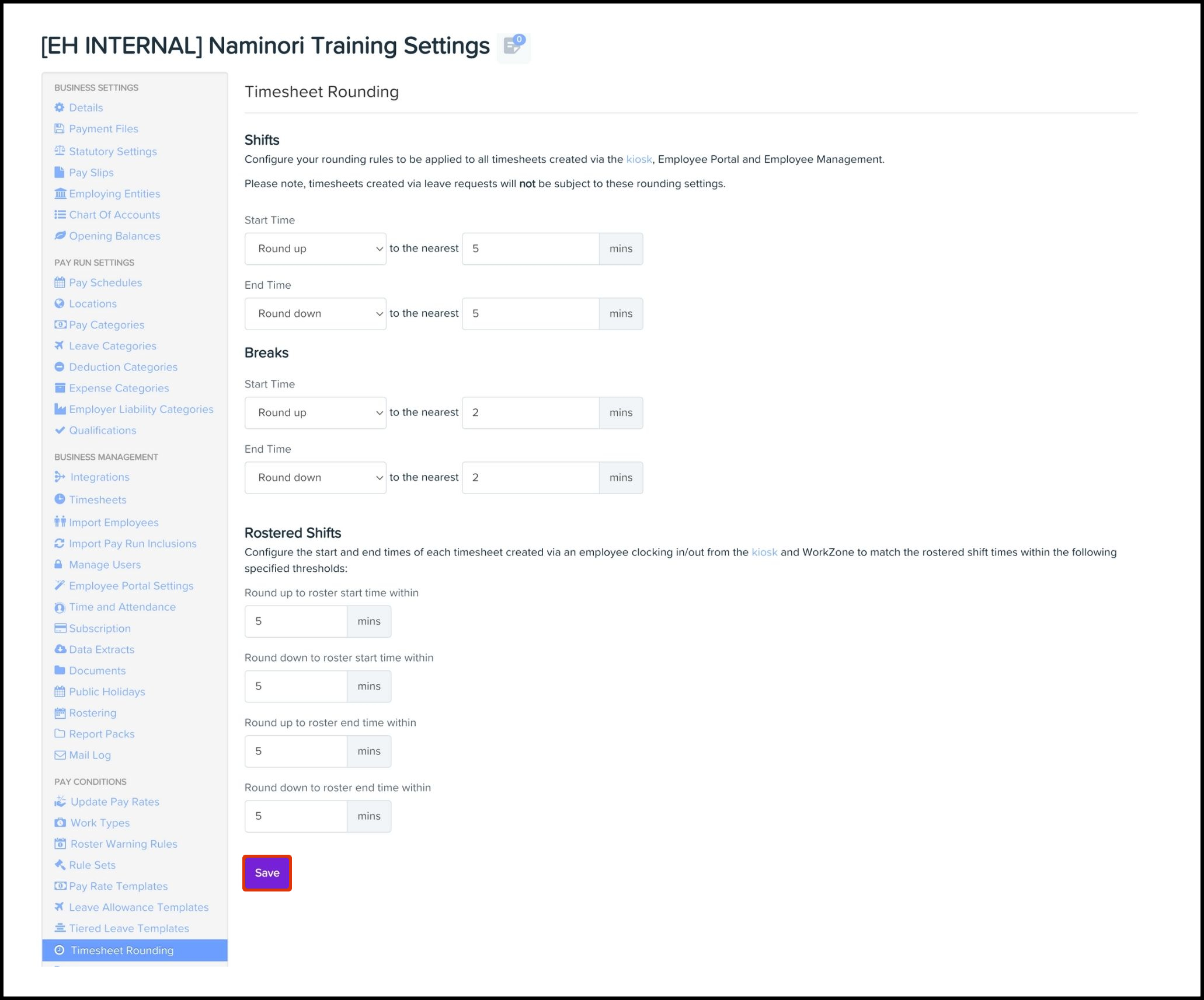 The timesheet rounding feature only works when an employee uses the payroll platform WorkZone or Clock-Me In apps to submit their time worked and therefore, does not flow through to your HR platform. This means that, for any employee timesheets submitted via the HR platform, the rounding settings you select using this feature will not apply to their timesheet submissions.