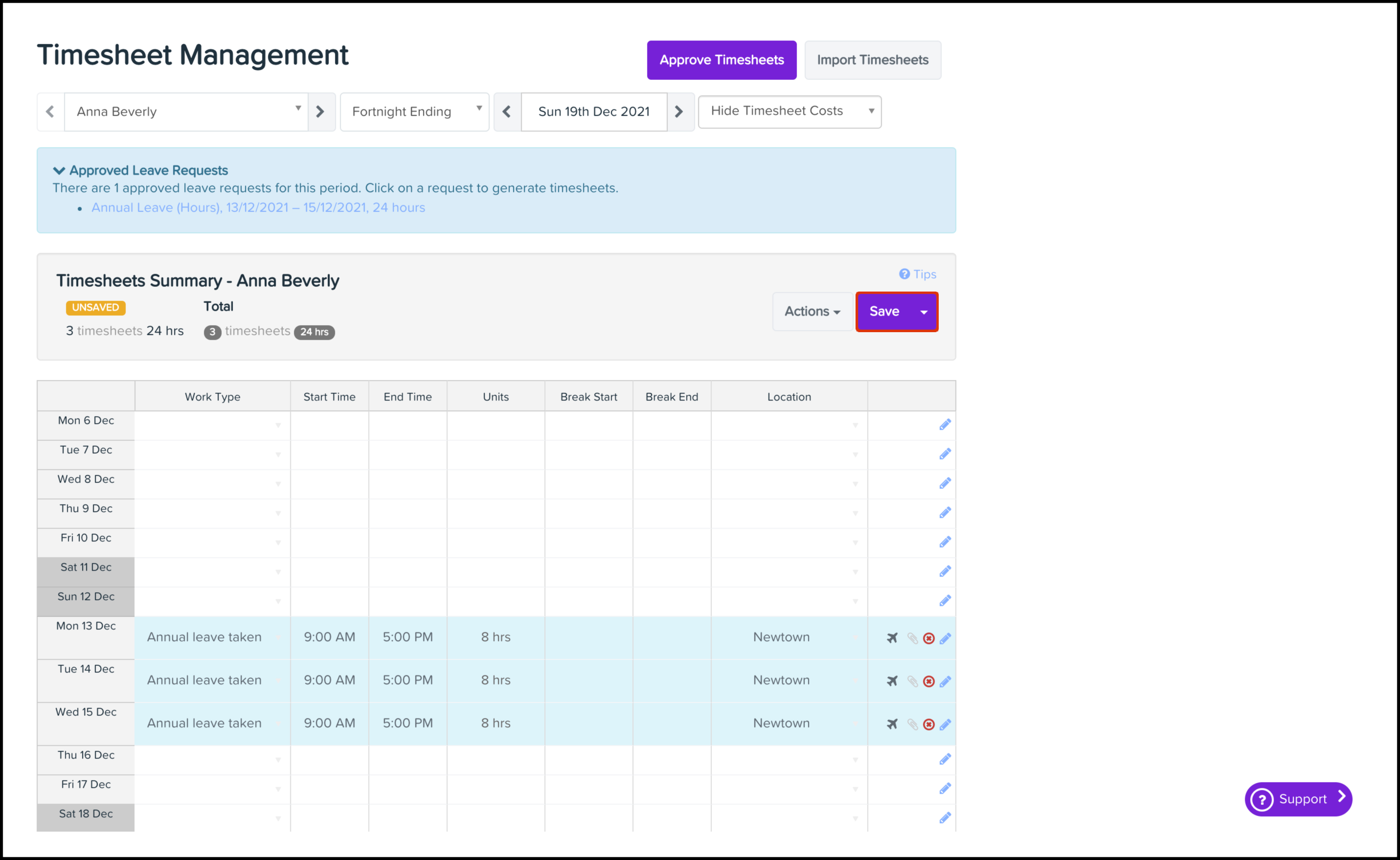 To apply a leave request as a timesheet, the employee must have the Annual Leave Taken Work Type enabled. To read further information on how to create a work type, refer to this article.