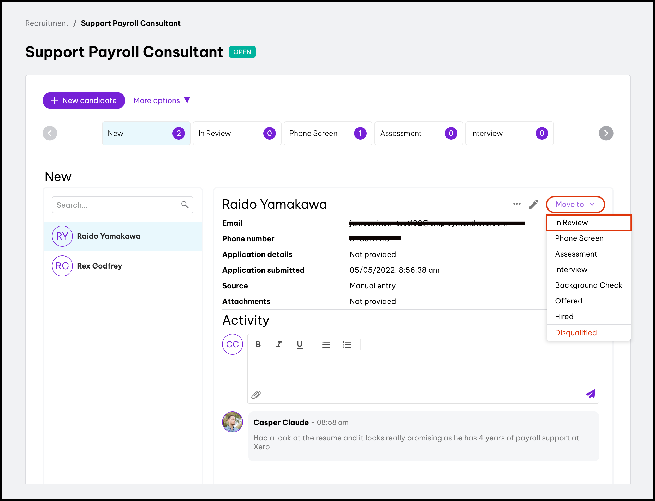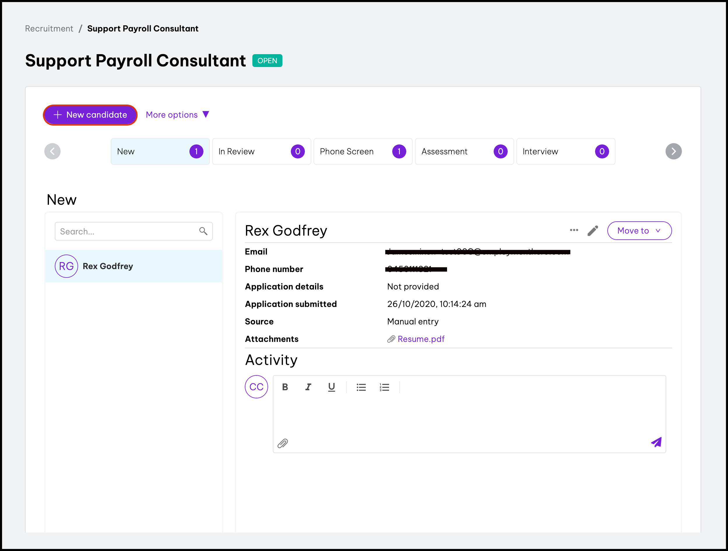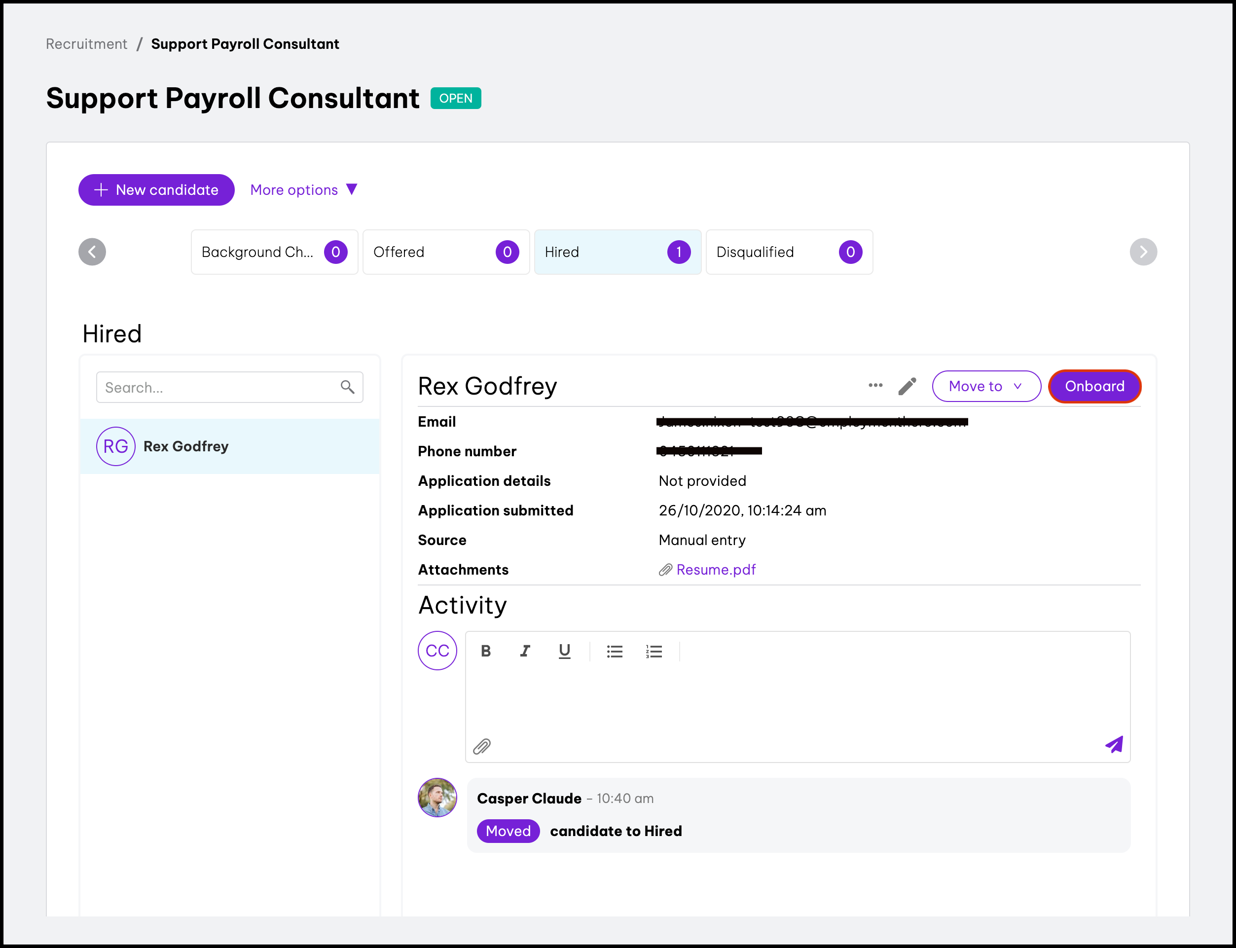The Candidate Pool feature within the Recruitment module allows you to see all the people who have applied for your open roles, with the ability to filter this list by status and/or name. You can also use this feature to view the candidates profile and see details such as their phone number and resume and copy a candidate over to a different role.