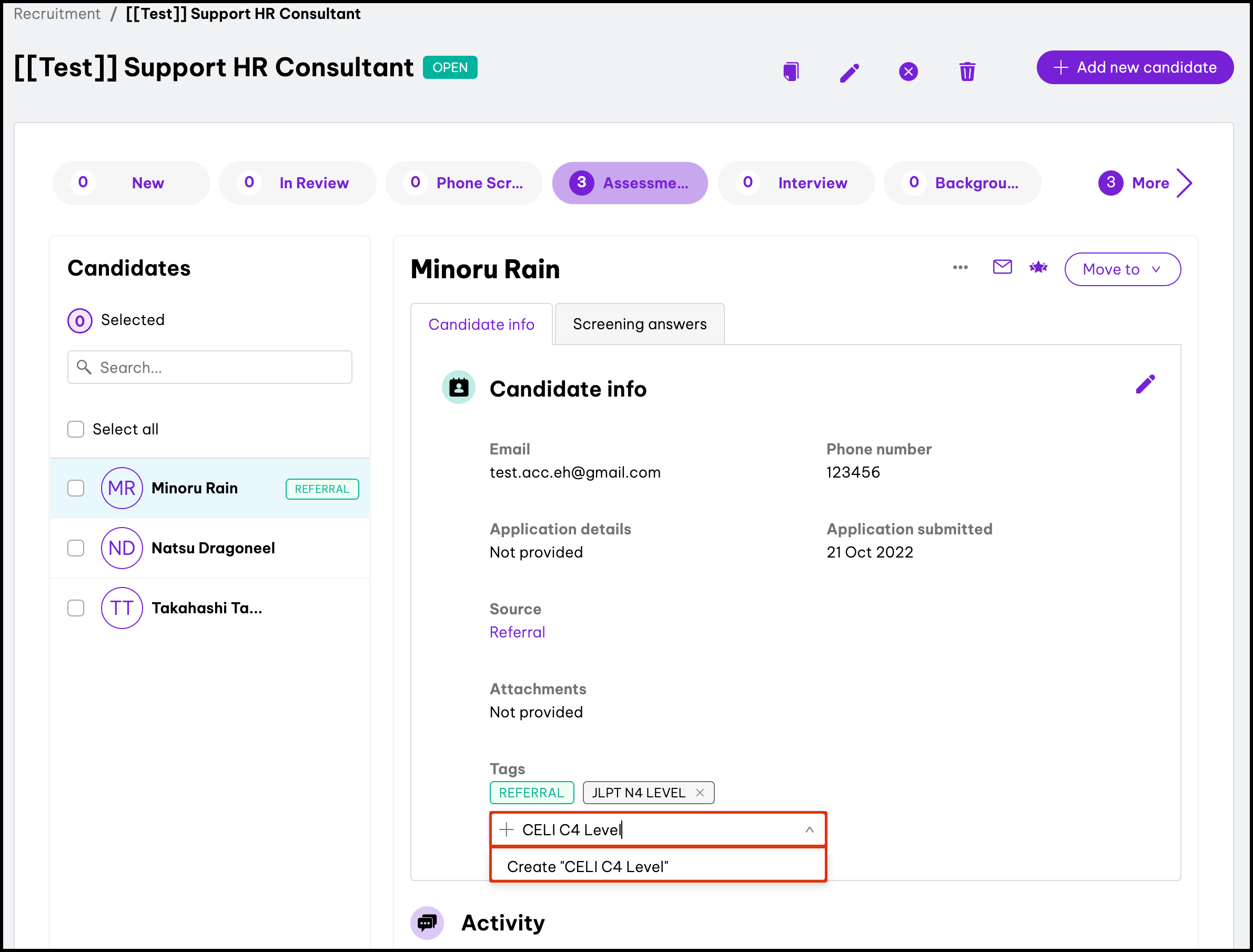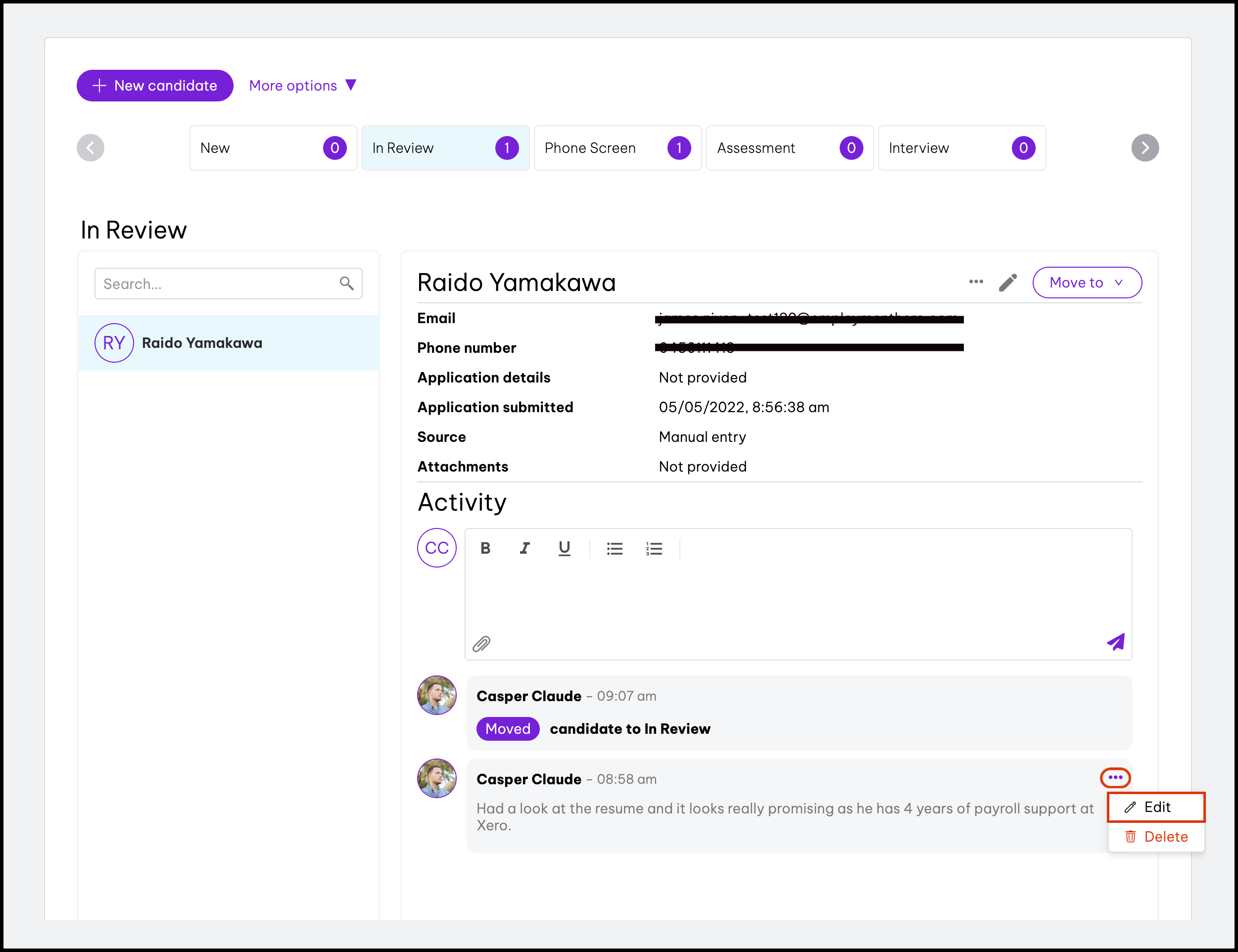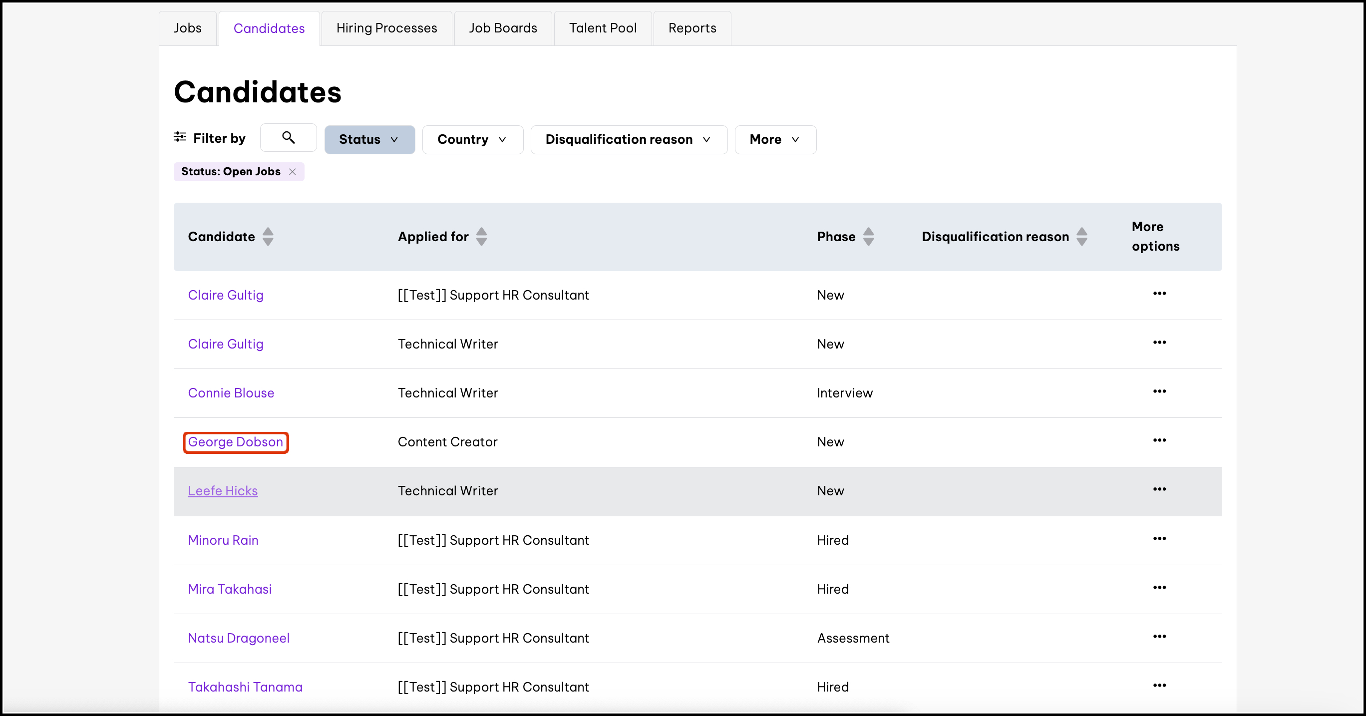 The Candidate Pool feature within the Recruitment module allows you to see all the people who have applied for your open roles, with the ability to filter this list by status and/or name. You can also use this feature to view the candidates profile and see details such as their phone number and resume and copy a candidate over to a different role.