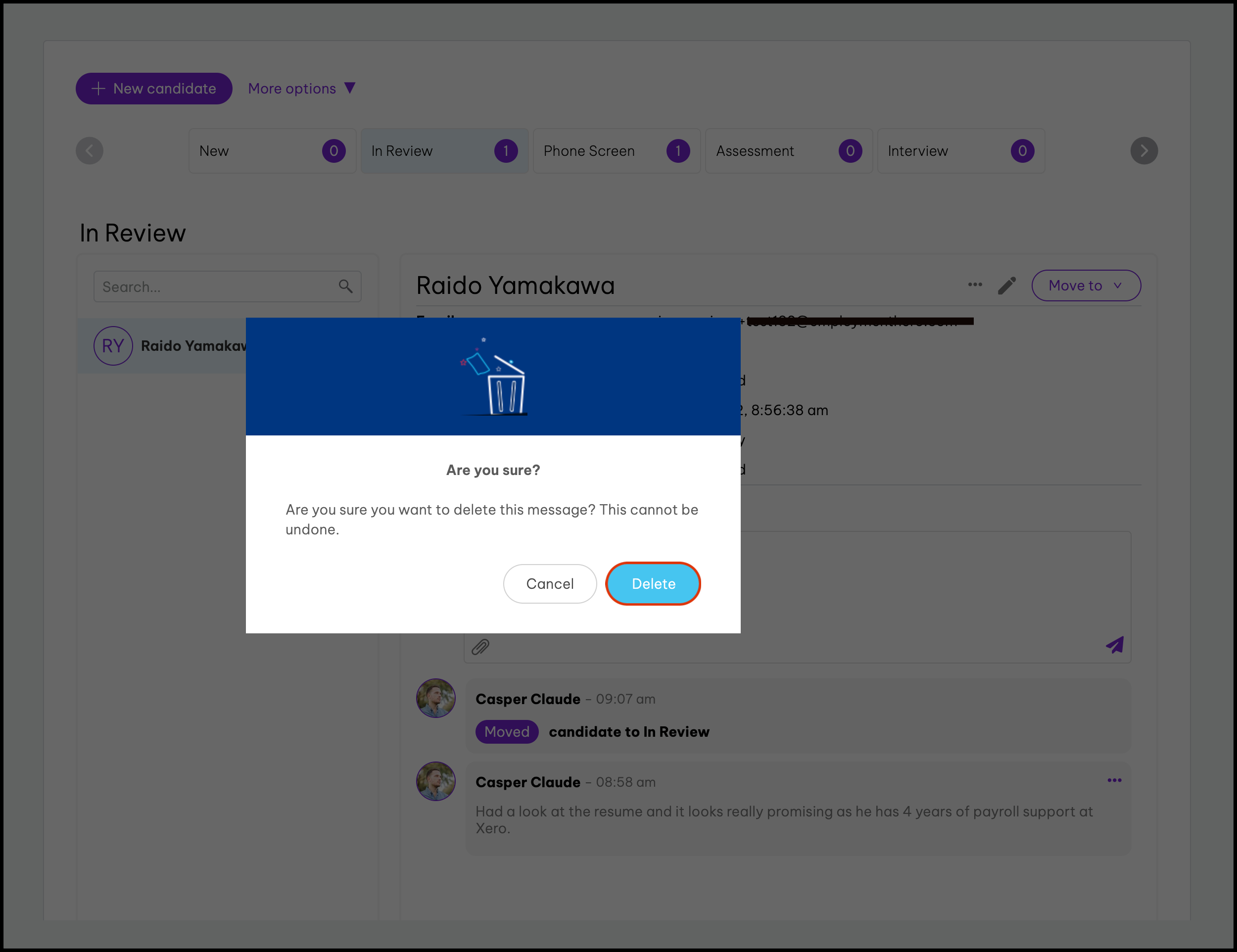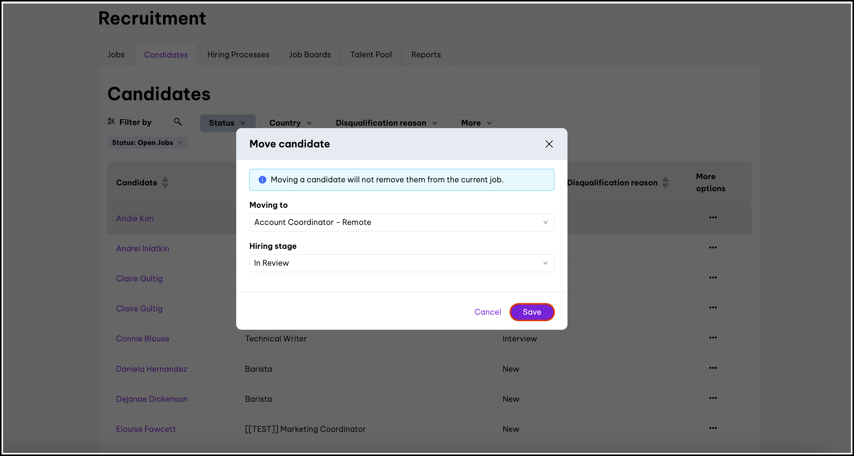 Copying a candidate does not remove them from whichever job/stage/talent pool they’re currently in.