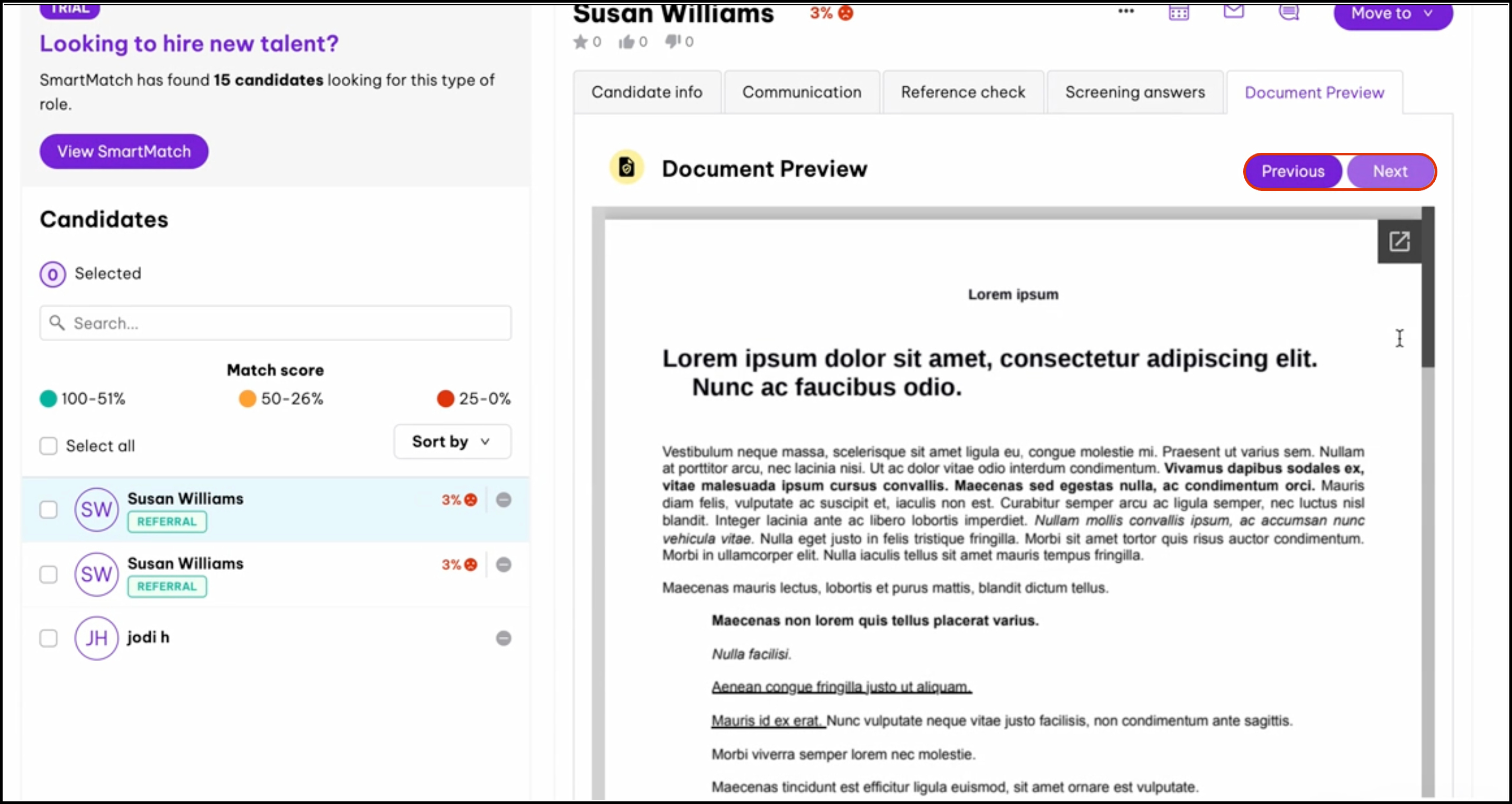 - Using the Search field to find a specific candidate.