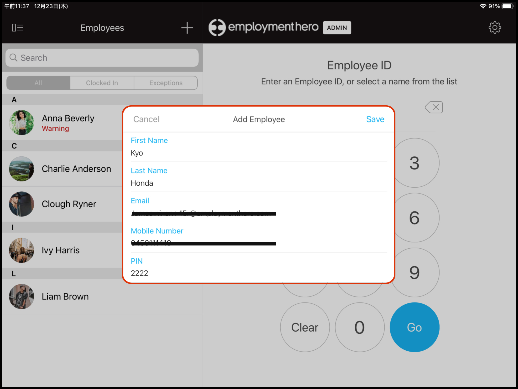 The Add Employee function on the Clock Me In App (downloadable for iPad users on the App Store) allows you to enter an employee's details and set up their access straight from the app. You will need to have enabled Admin Mode first before you can access this feature.