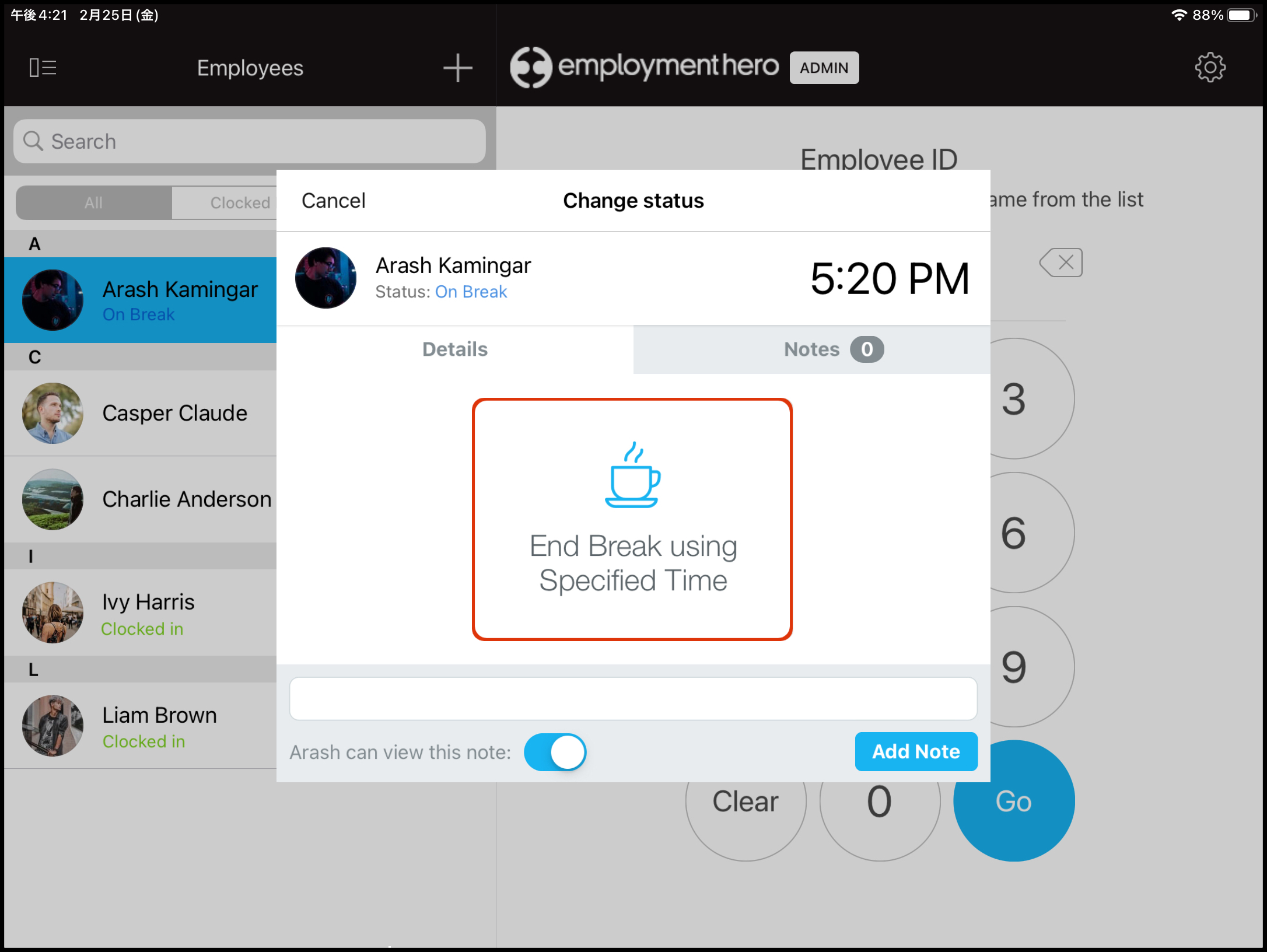 The End Break Using Specified Time function on the Clock Me In app (downloadable for iPad users on Apple's App Store) allows you to end an employee's break at a pre-determined time. You will need to have enabled Admin Mode first before you can access this feature.