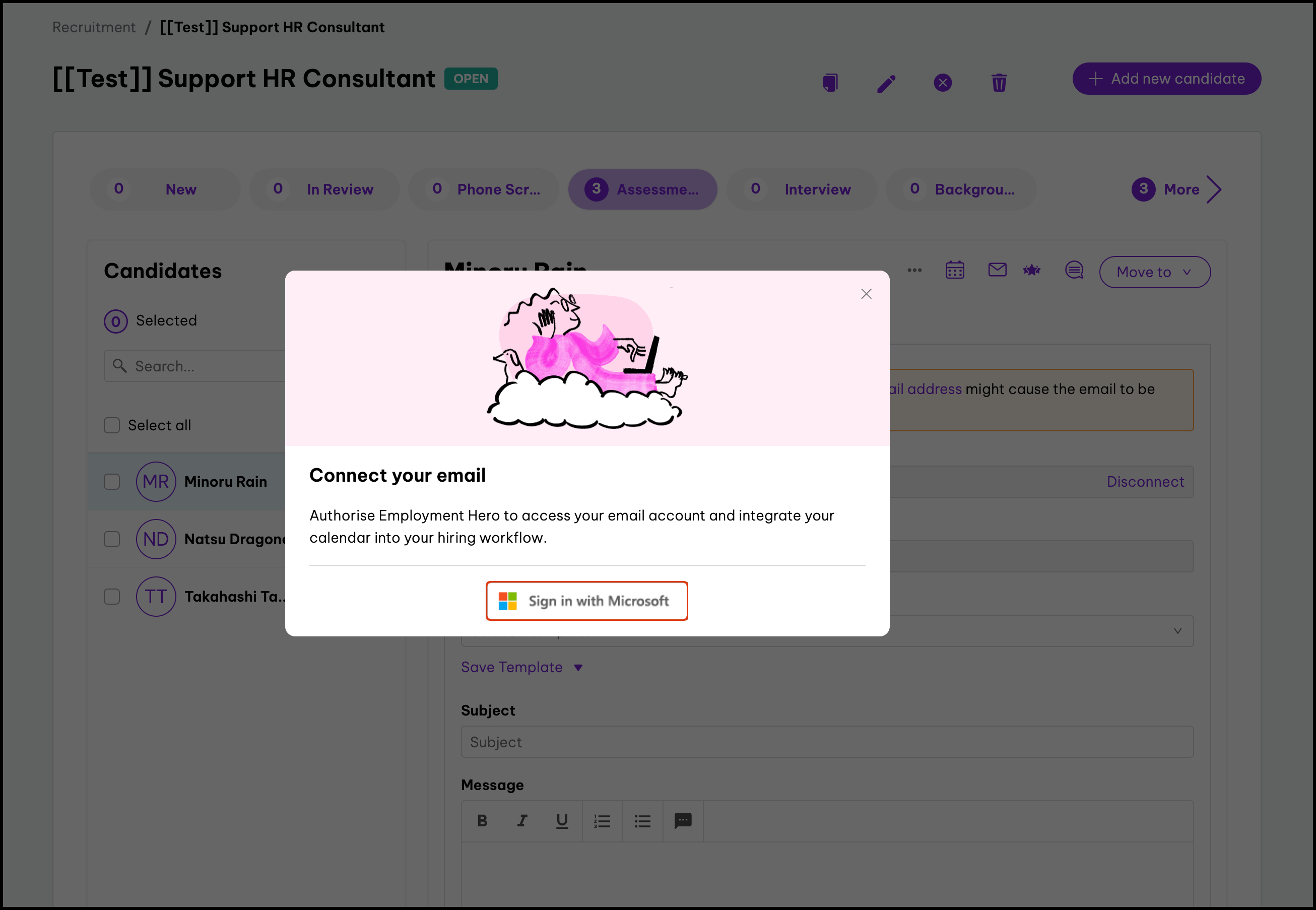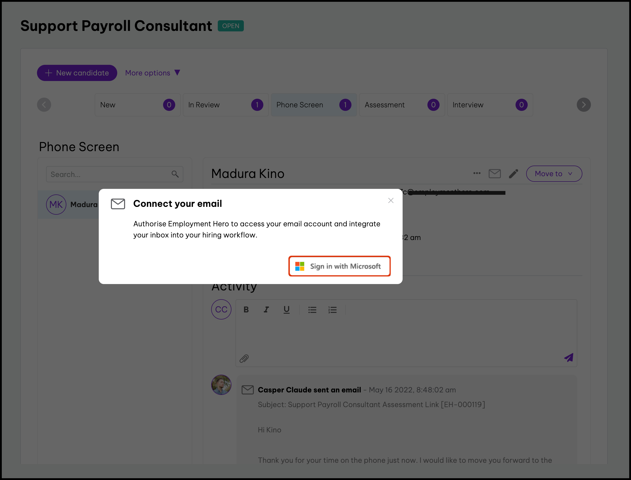The Microsoft Outlook Integration feature allows you to connect the recruitment module to your Microsoft Outlook account and send candidate emails directly from the HR platform. However, you will not be able to add a user to a calendar invite if they do not have an email address on their file. You can also use this feature to disconnect this integration if you no longer want to send Outlook emails via your recruitment platform.