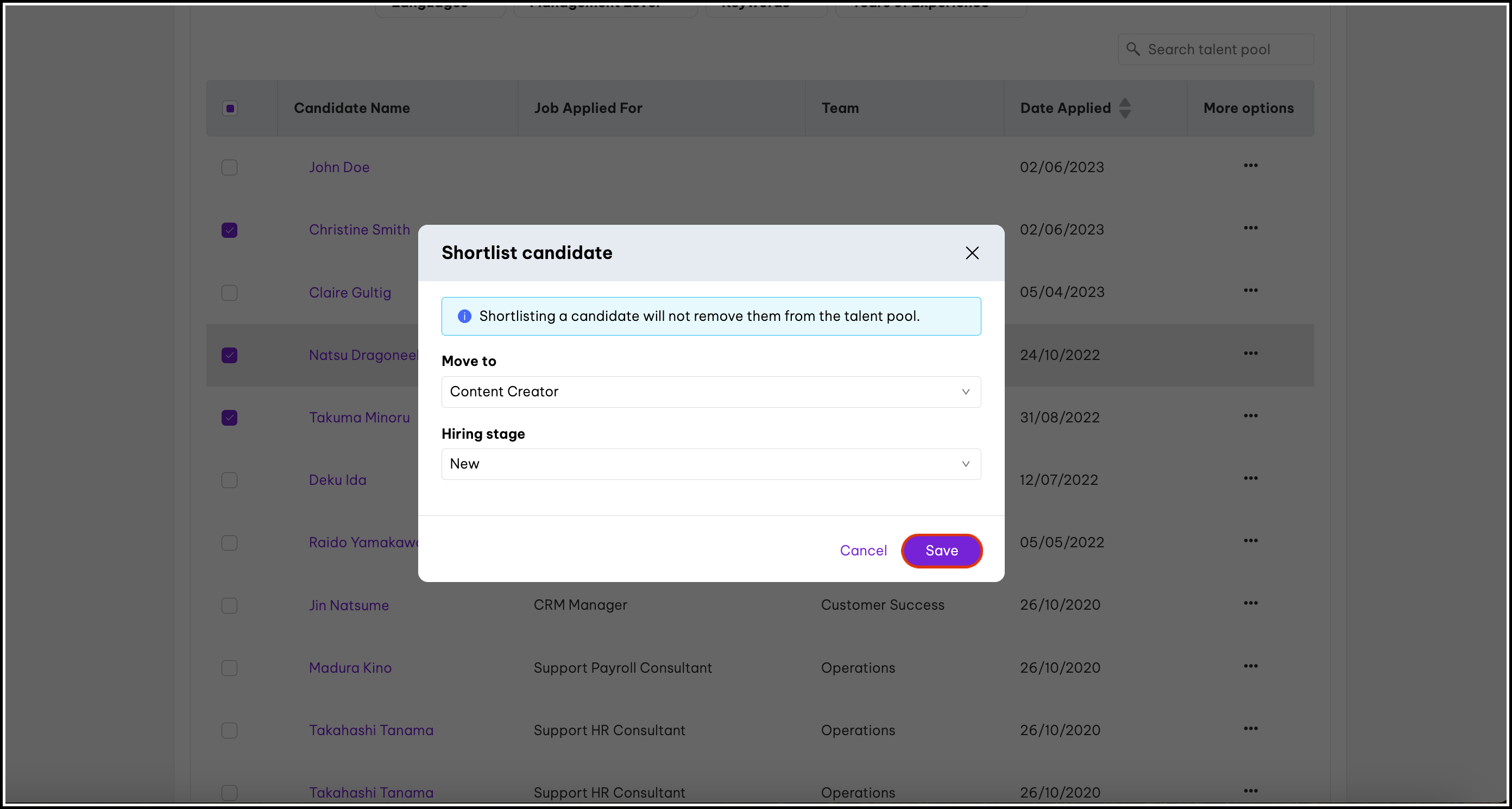 7. Select the hiring stage to move the candidate to.