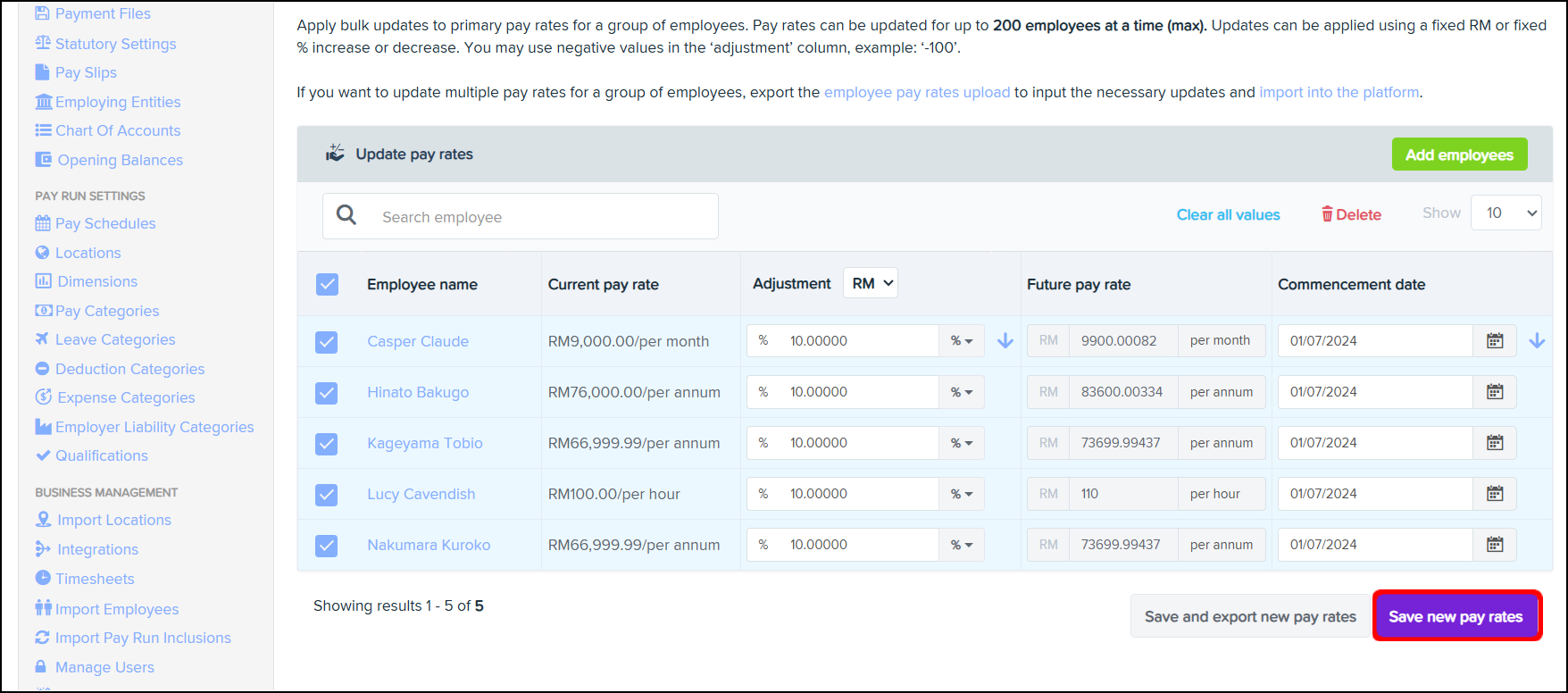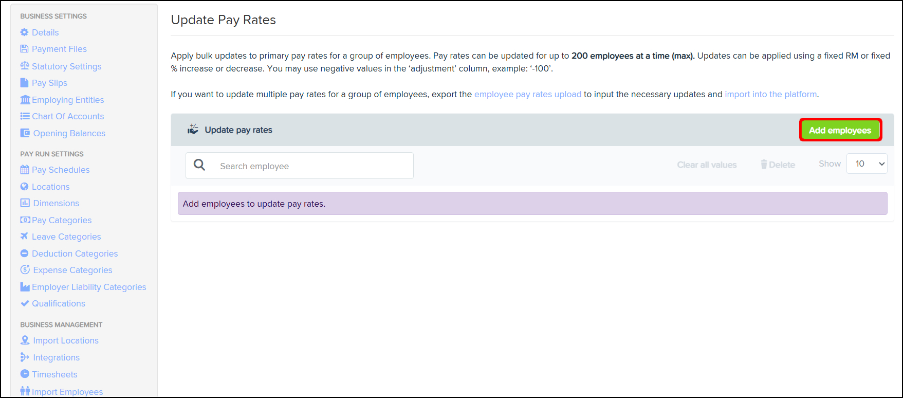 The bulk pay rate feature allows you to update salaries and pay rates for up to 200 employees at once, without having to update each employee's pay rate individually.