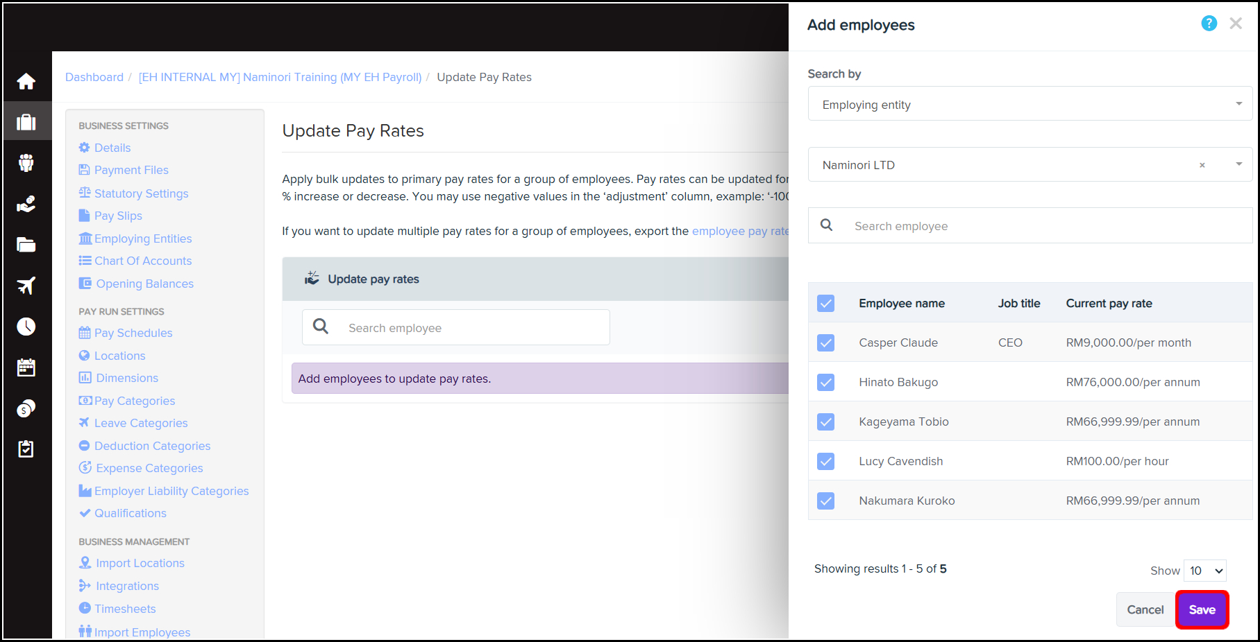 - Create and manage rule sets This feature allows you to create and set different employee payment rates, depending on the pay conditions assigned to your employees.