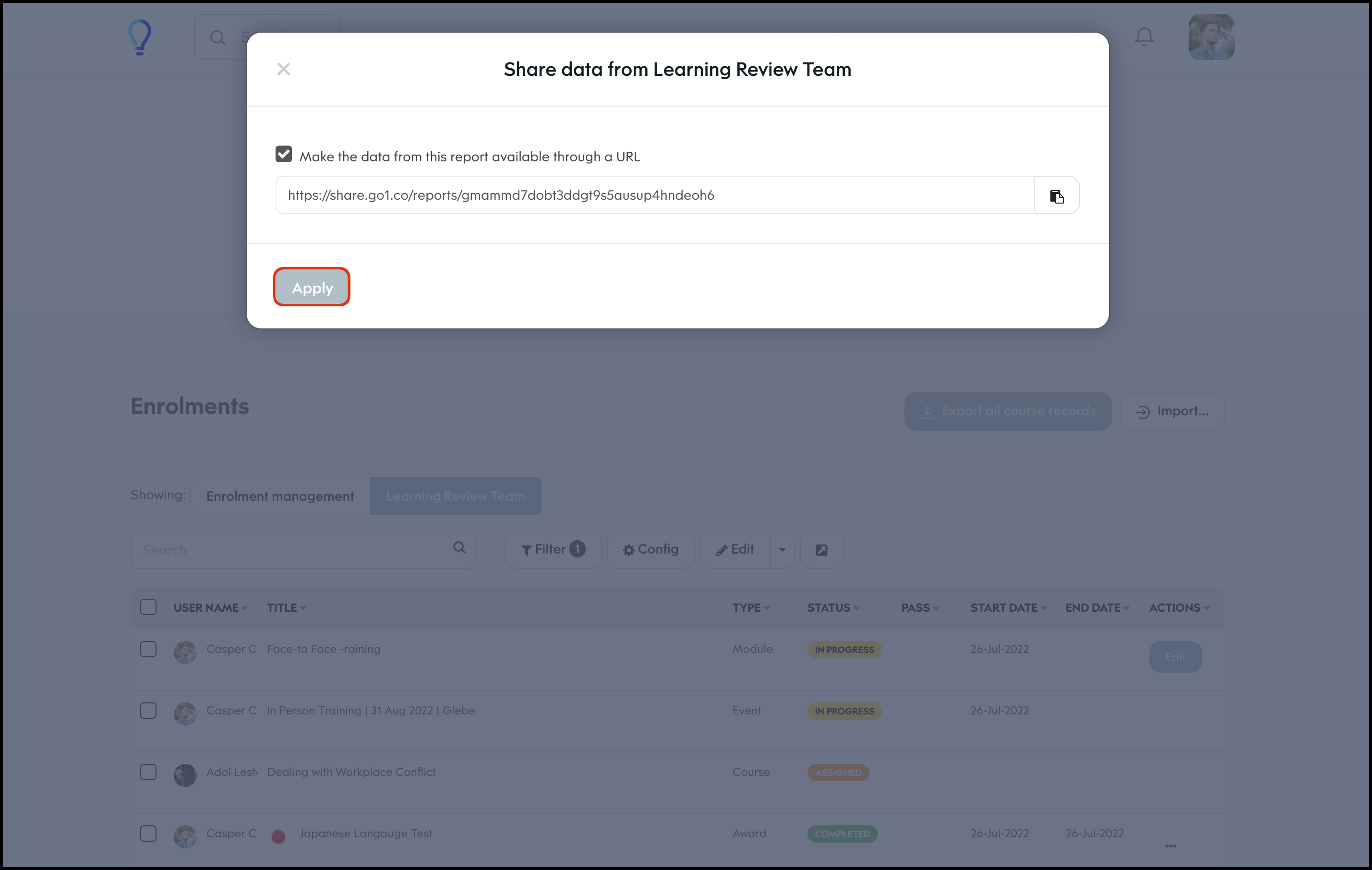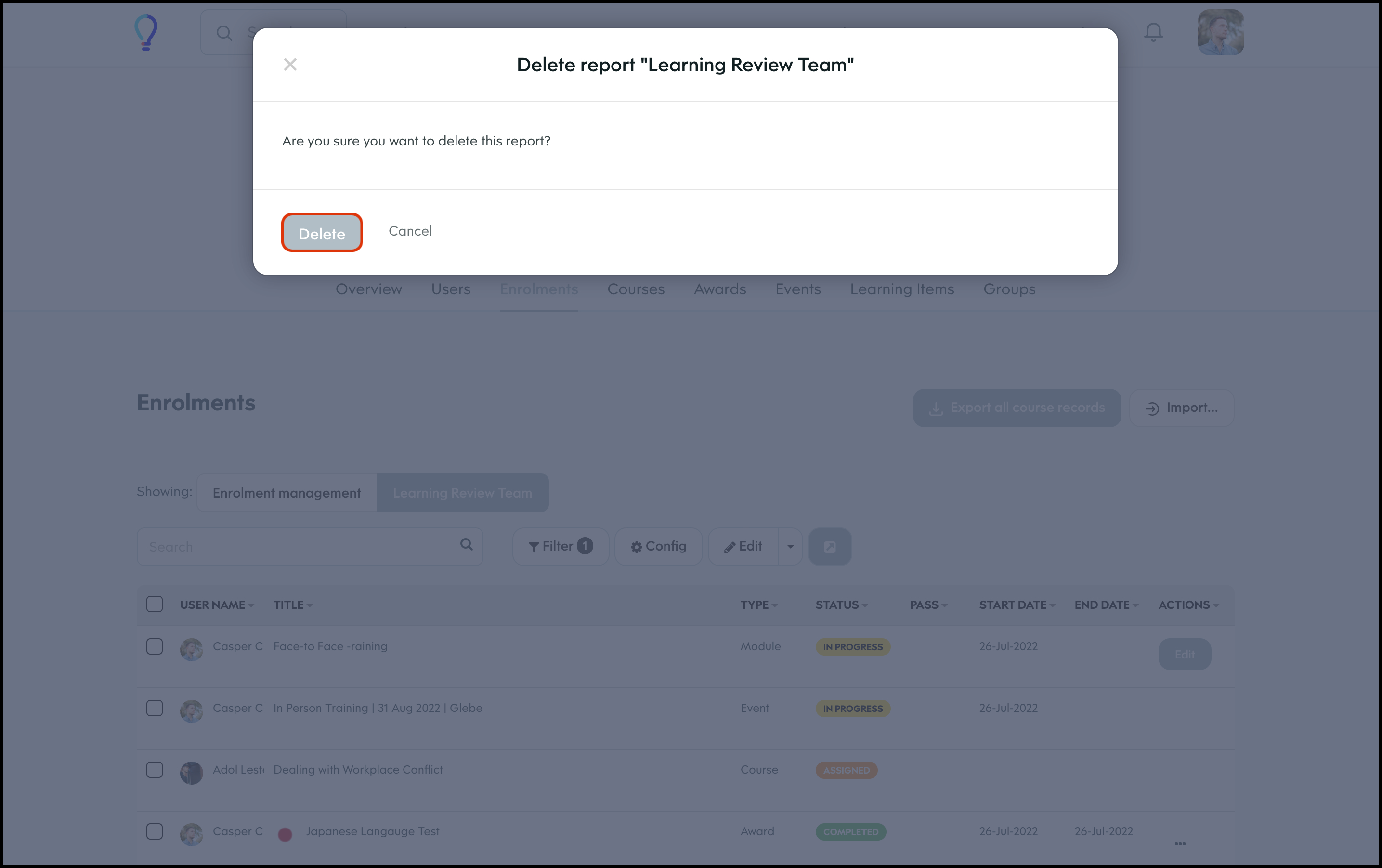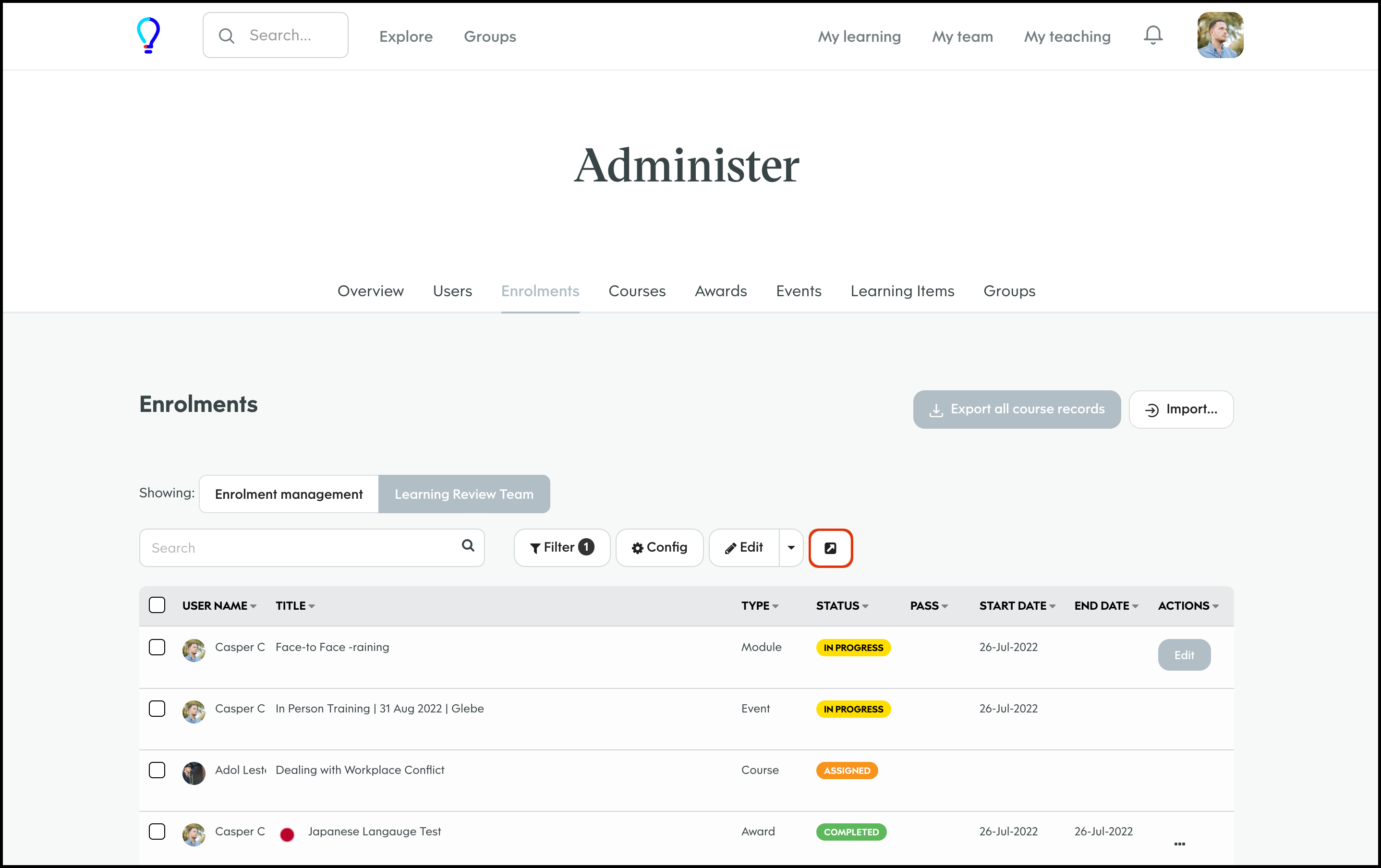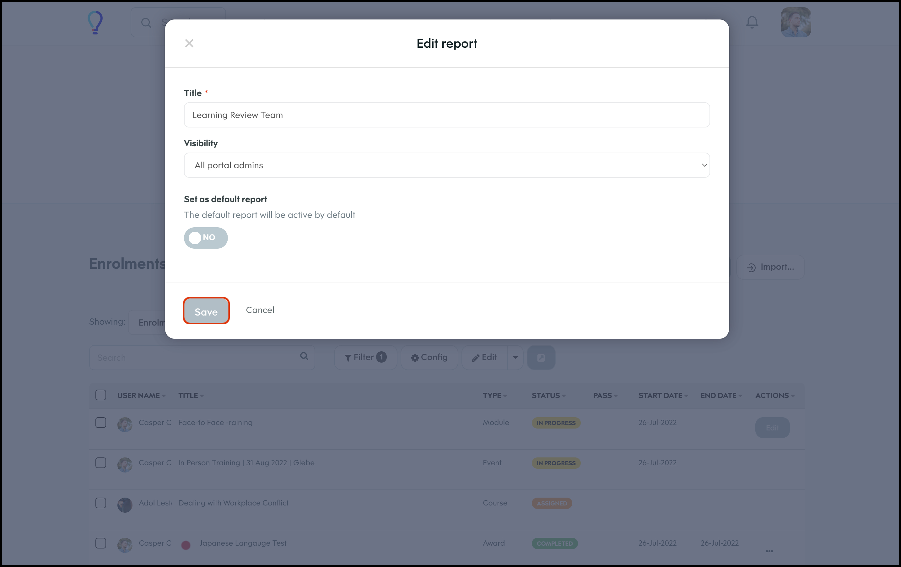 The Enrolment Management section lets you customise your report page by choosing to have the data shown in a table, calendar, or histogram. You can also customise what columns to include in each of these layouts and then save this view so you can access it again later. Finally, you can share this custom view with others on your learning platform, edit the information if it changes, and delete a record if it is no longer relevant.