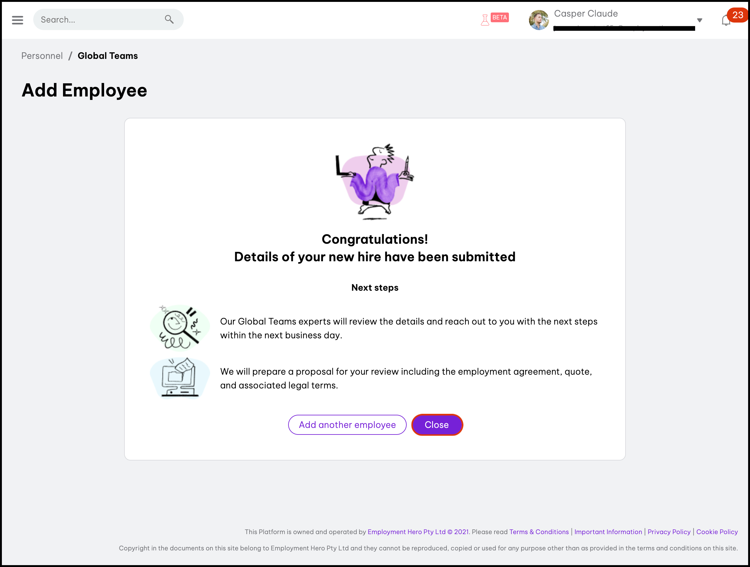 You can use the Add Global Teams Employee feature to add a new Global Teams employee to your Employment Hero HR platform.