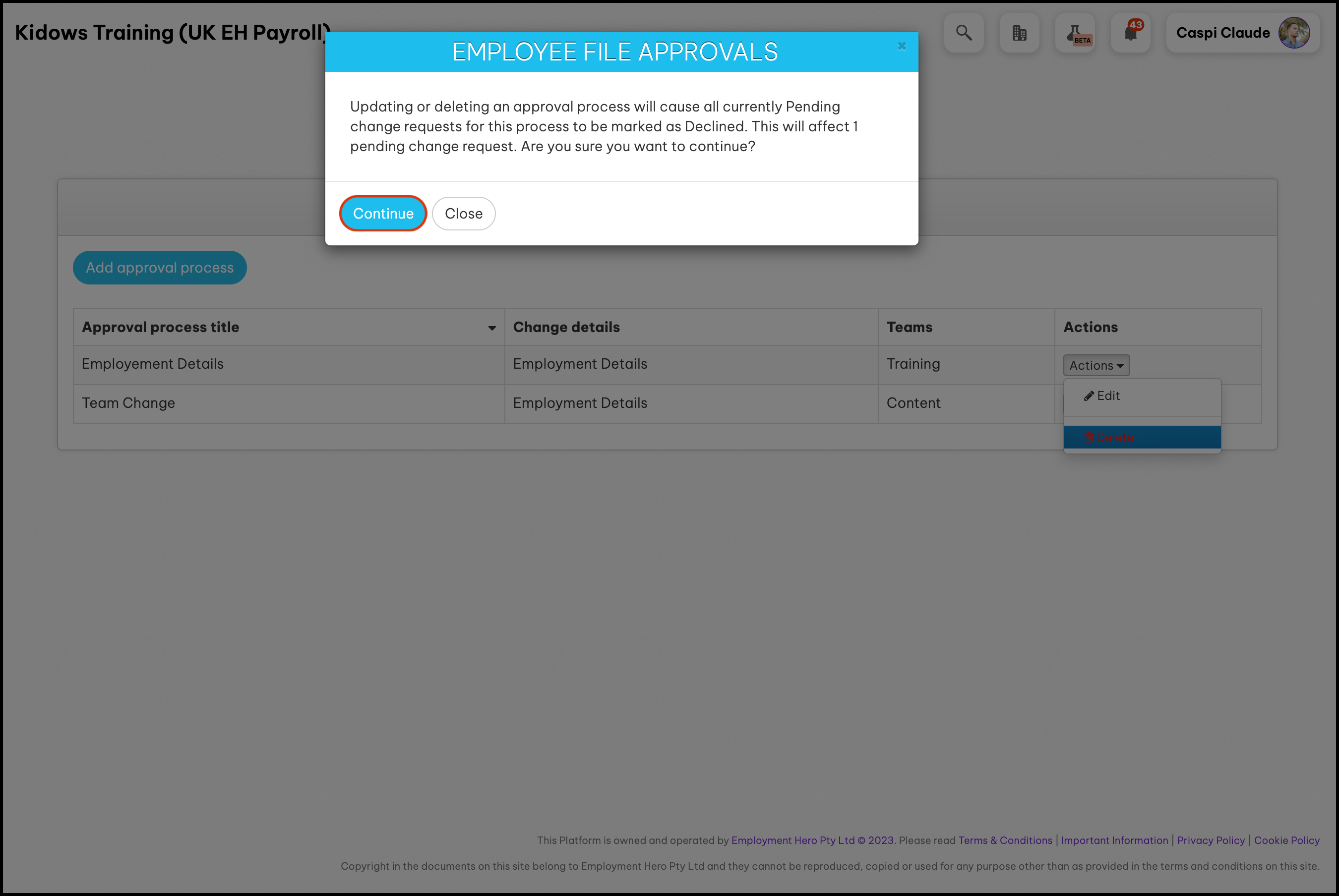 The new Employee File Change Approval Workflow has replaced this legacy version of Employee File Approval Processes found under settings. To learn how to create a Employee File Change Approval Workflow, see this article.The Employee File Approvals Set Up feature lets you configure your organisation's process for approving changes to employee files on your HR platform. It allows you to designate approvers, edit the approval process as needed, and remove outdated entries. Before using these features, you must enable the open beta feature, Approvals, through the Beta Flask drop-down by selecting Opt-in. Keep in mind, this feature is still under development and may change. For more information on enabling this beta feature, please refer to the linked article.