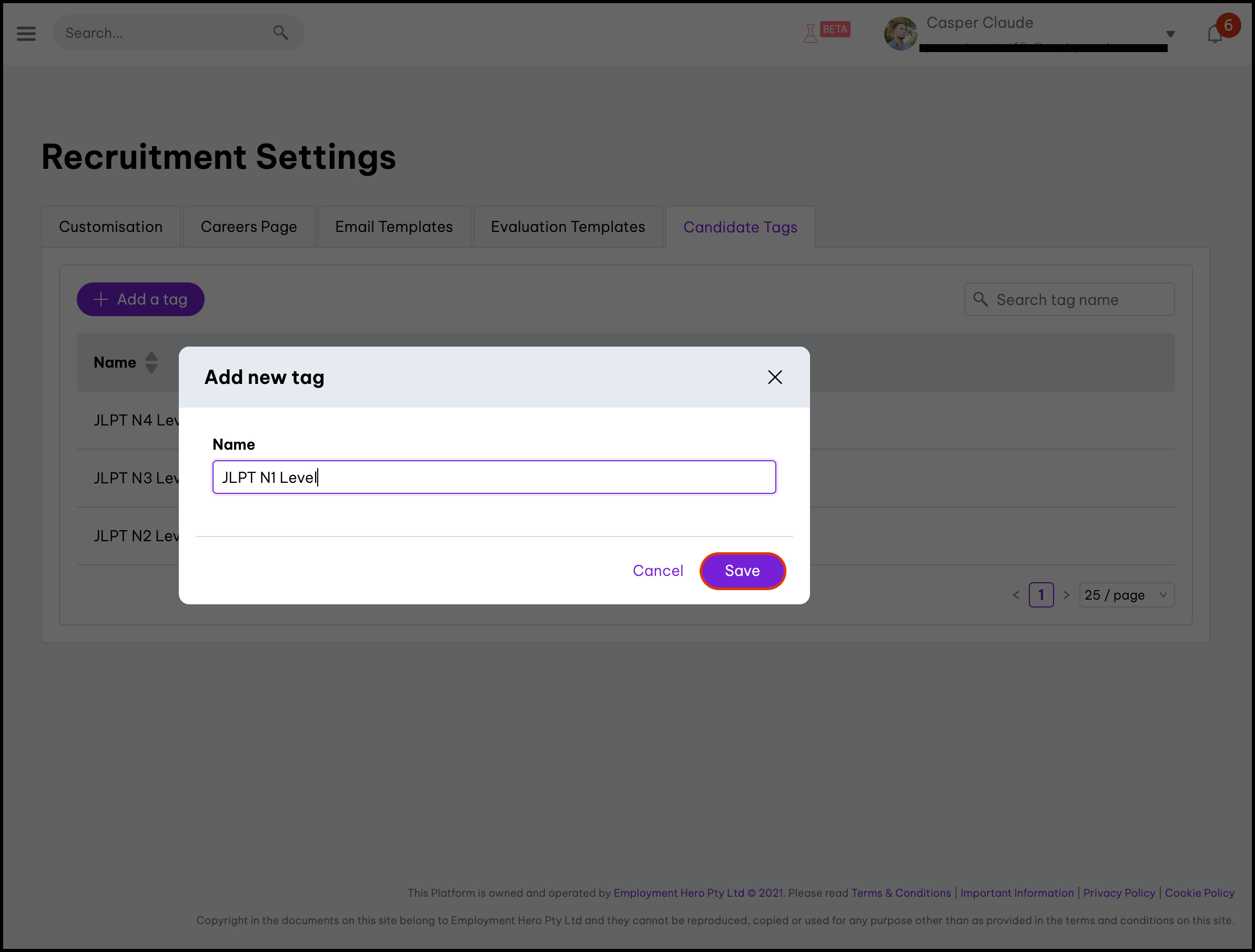 The Candidate Tag feature improves recruitment processes by enabling you to create and apply custom tags to a candidate's profile. These tags can signify key qualifications or traits, making it easier to categorise and retrieve candidate information quickly. For example, you might tag a candidate with an Excel Certified tag to show proficiency in the software.