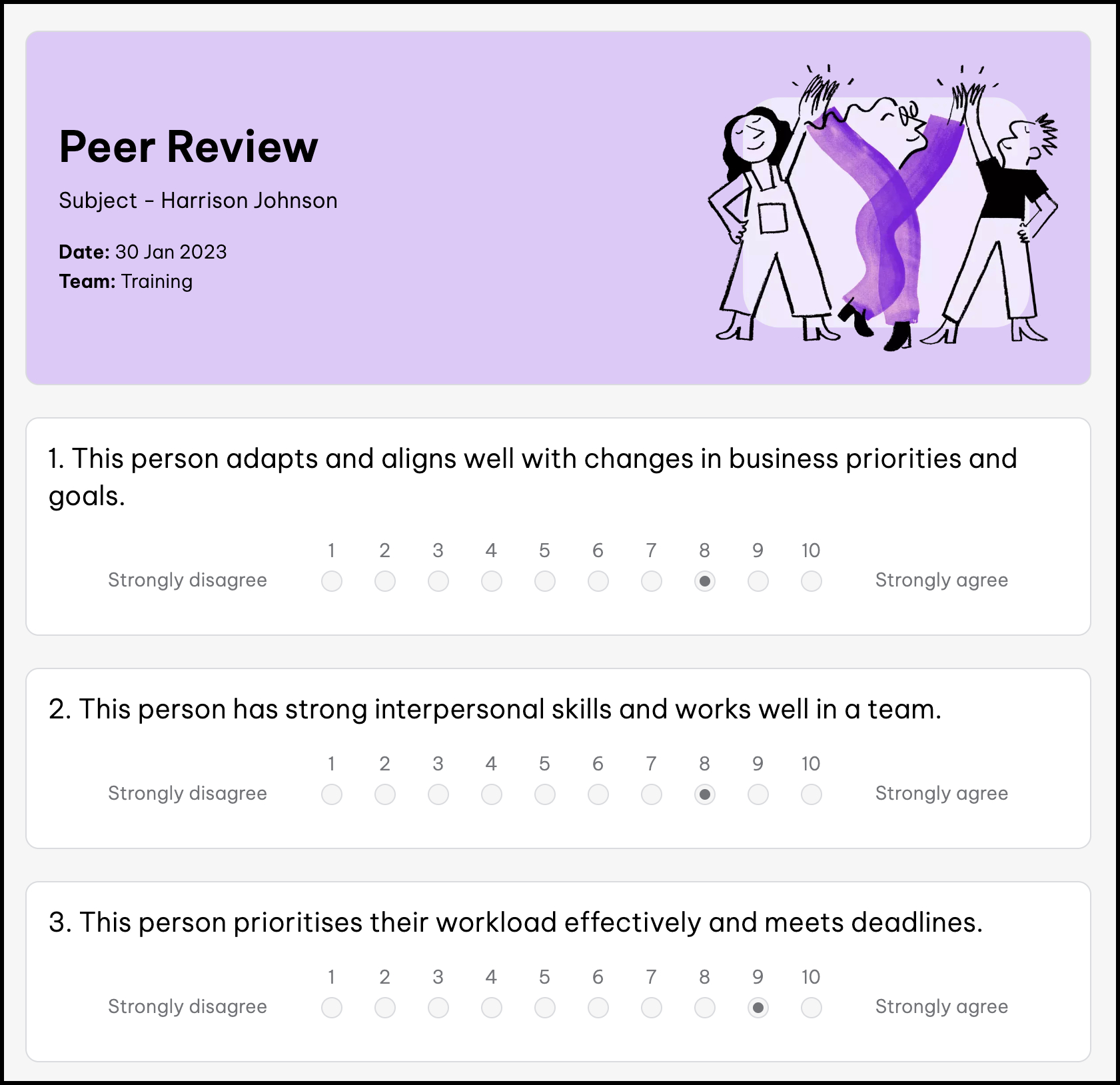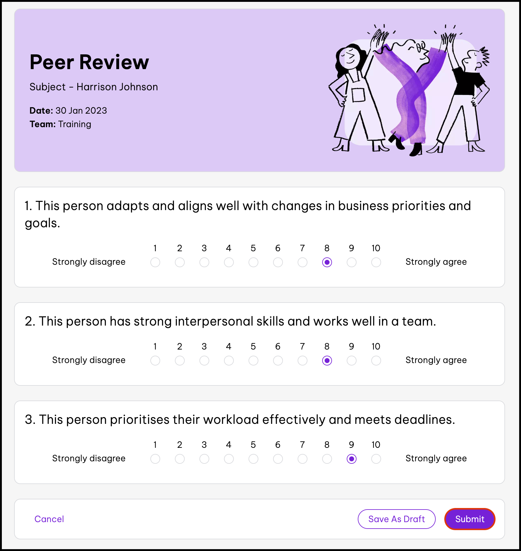 Once you complete a 360 self or peer review, you can not edit your responses, so please make sure you double check your answers and that everything is correct submitting your responses.