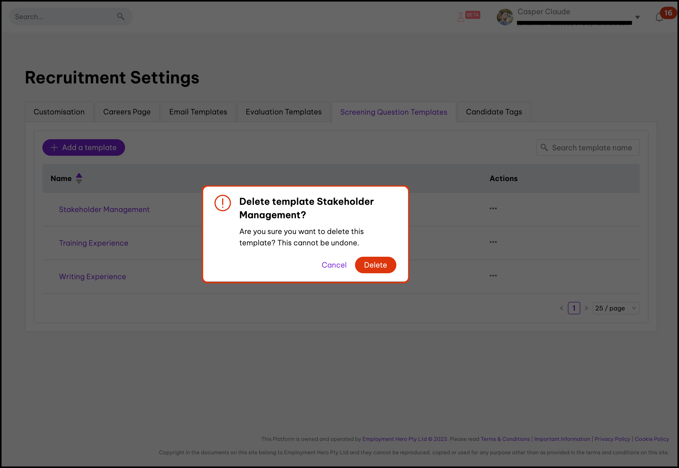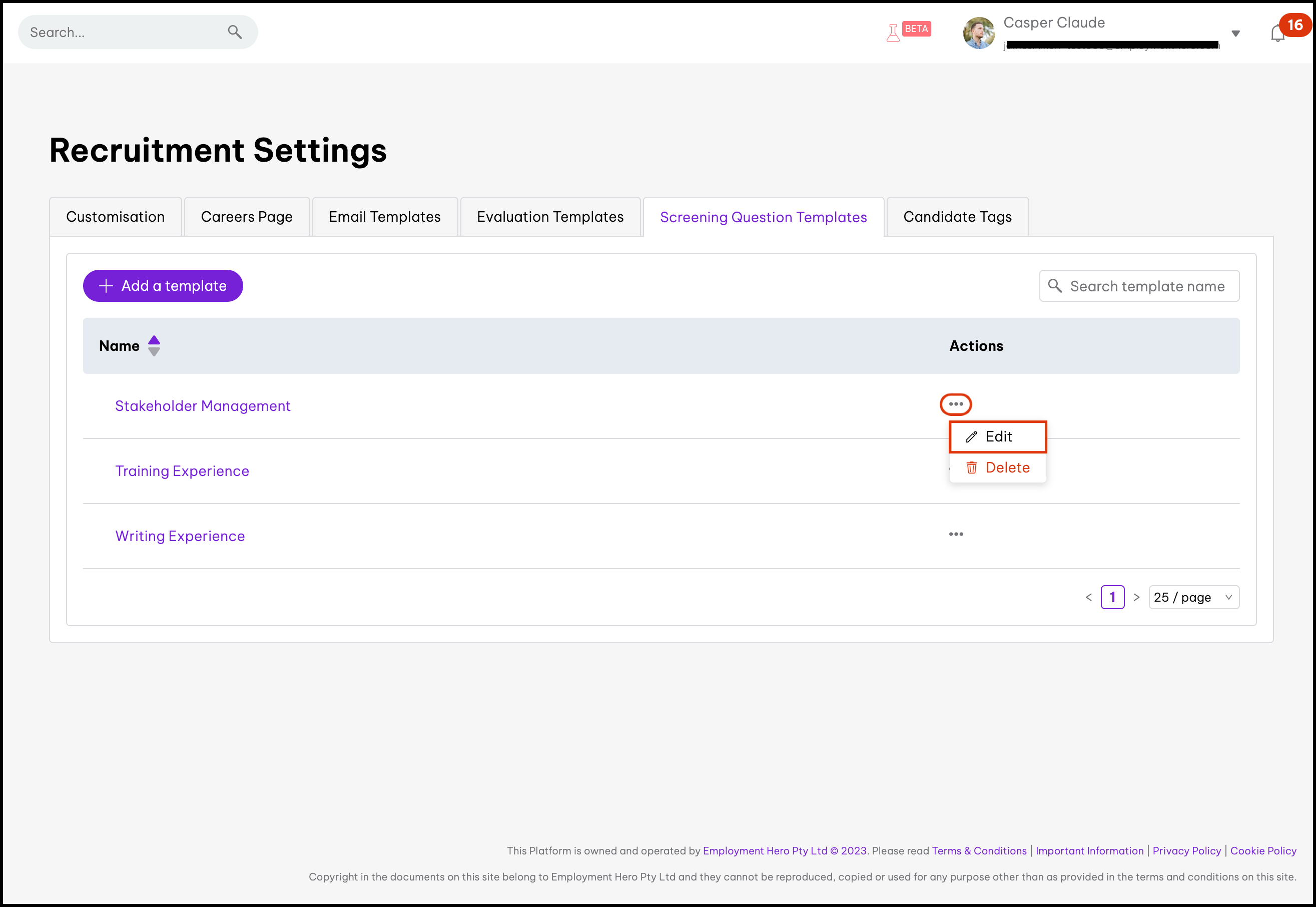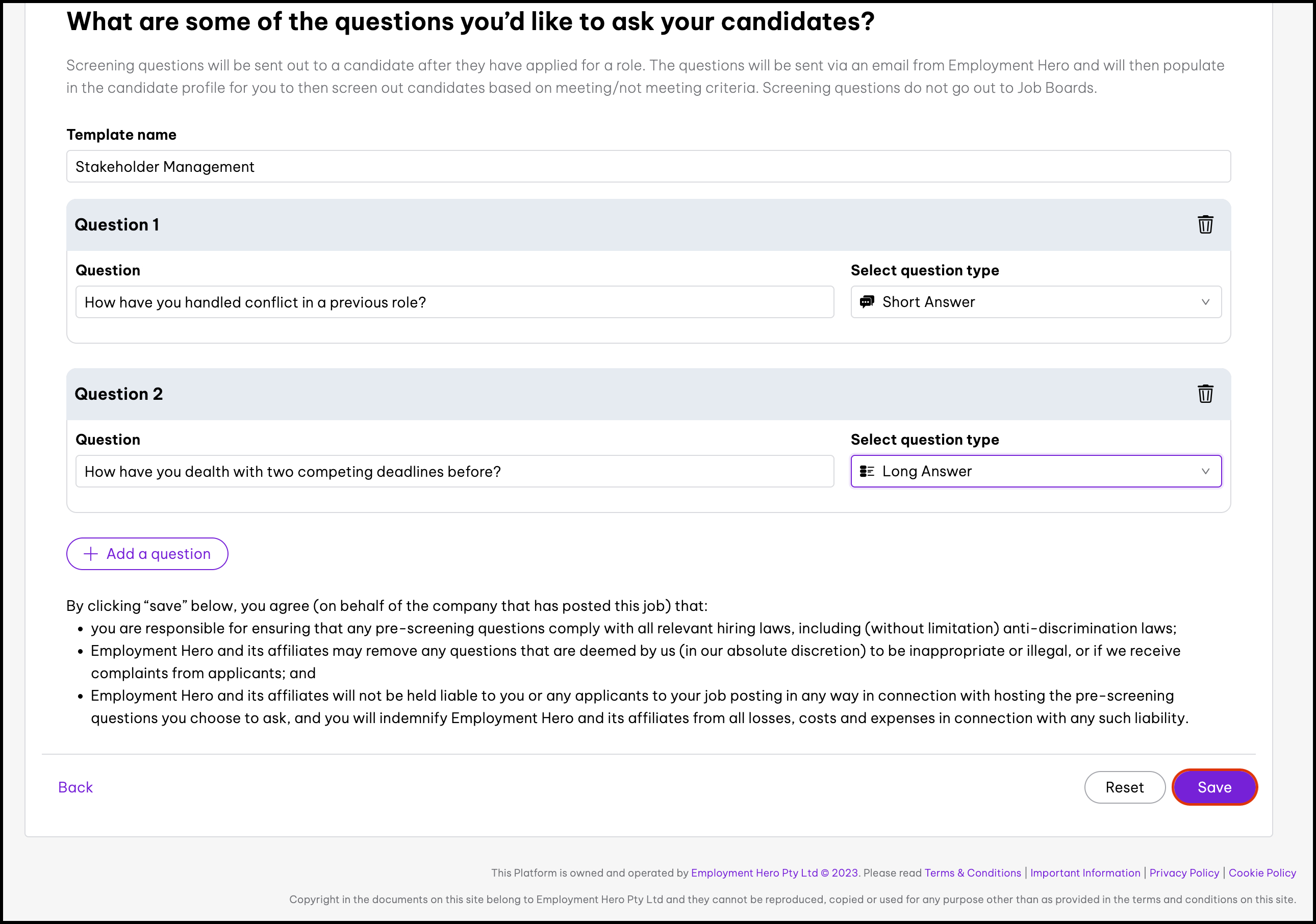 The Screening Questions Templates feature allows you to create your own screening question templates that you can send out to your candidates. These templates can include a range of questions, for example, short or long answer, date-based, multiple choice etc. You can also use this feature to edit the information if it needs updating and to delete an entry that you no longer need.