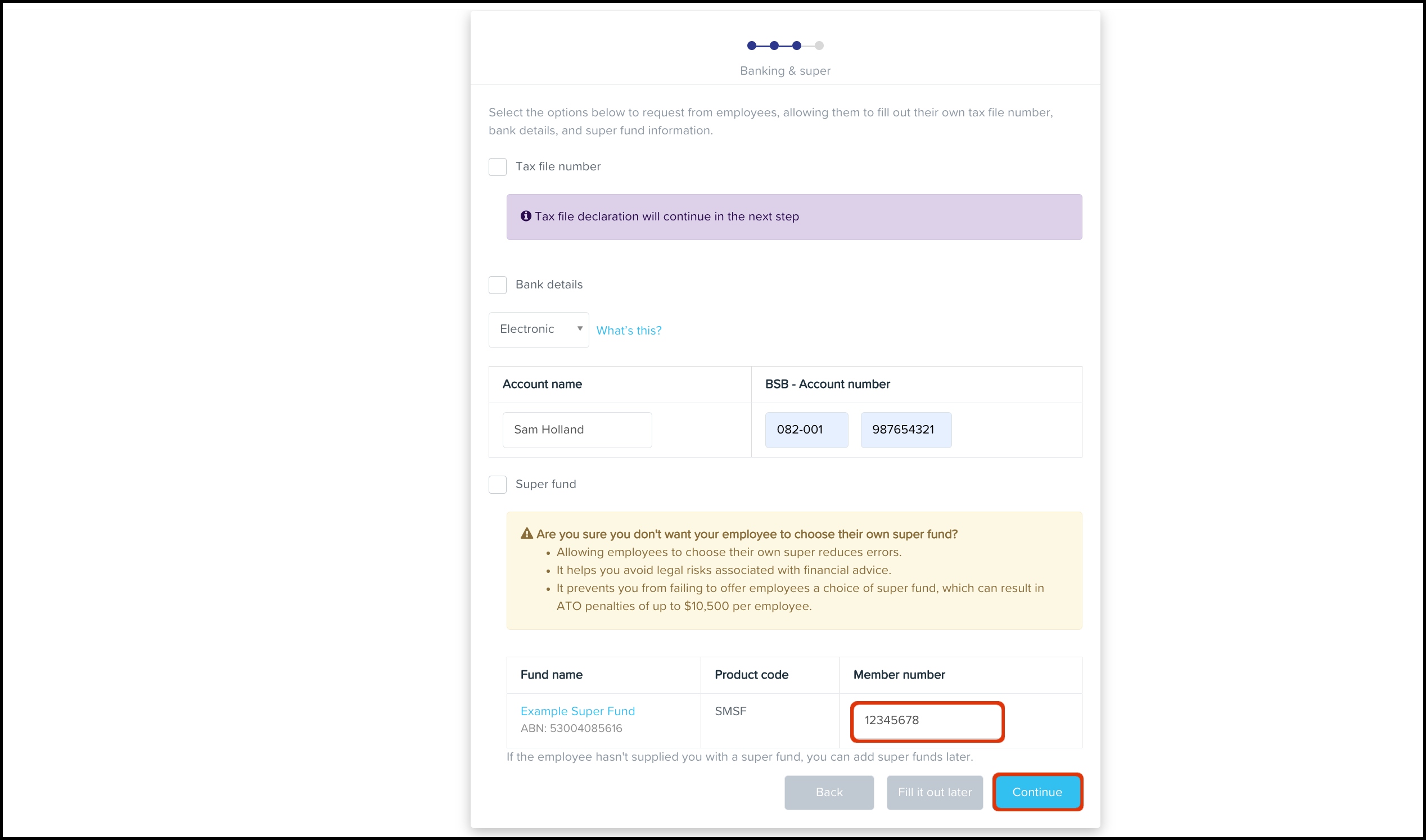 7. Back in the Banking & super form, enter the member number in the Member number field then click Continue.
