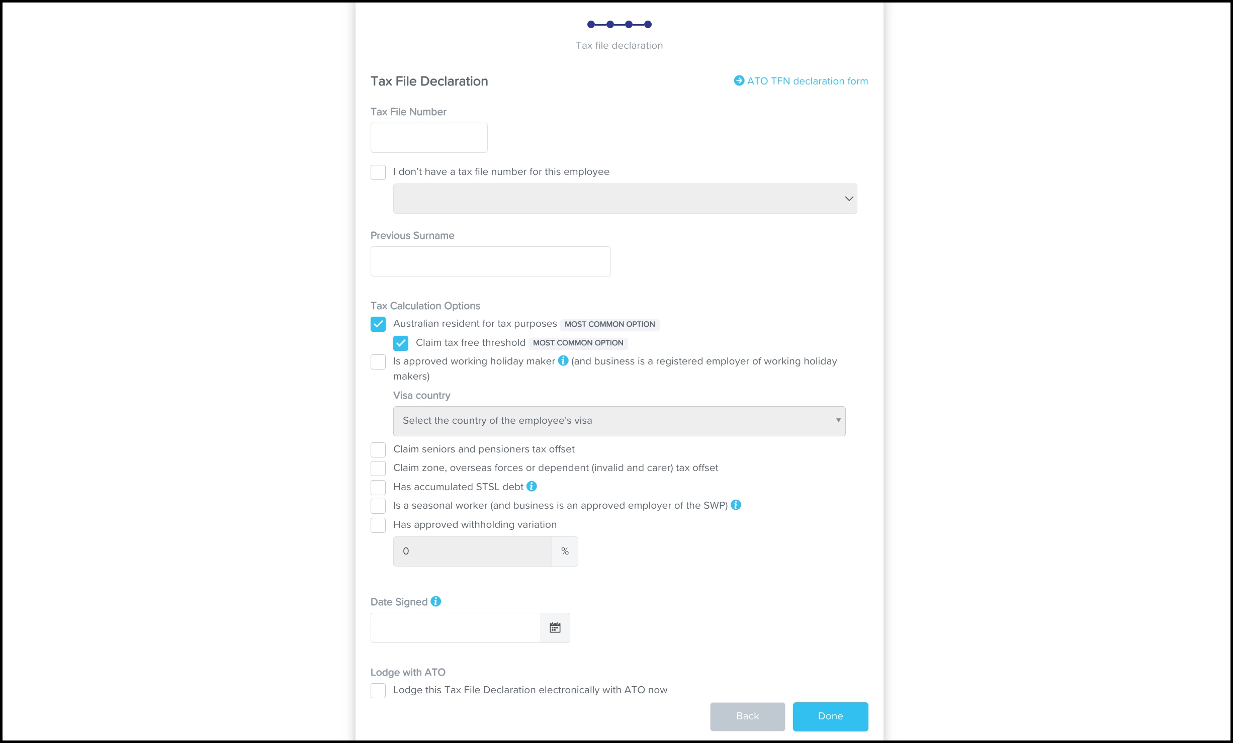 For more information, you can click the ATO TFN declaration form button at the top right corner of the section. Doing so will open the Australian Tax Office’s guide on completing a tax file number (TFN) declaration in your browser.