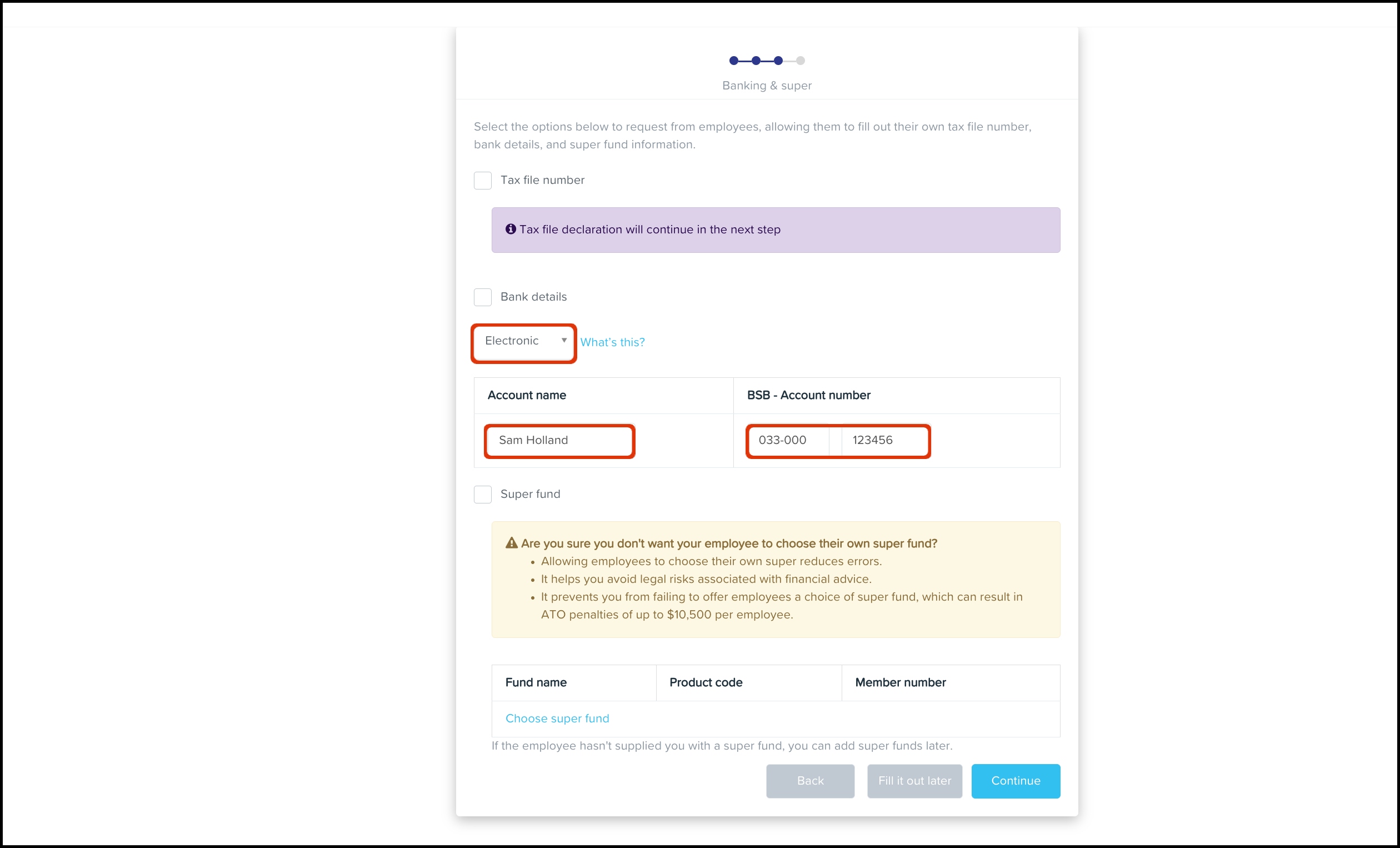 2. If you chose either Electronic or Manual deposit, enter the employee's details in the Account name and BSB - Account number fields.