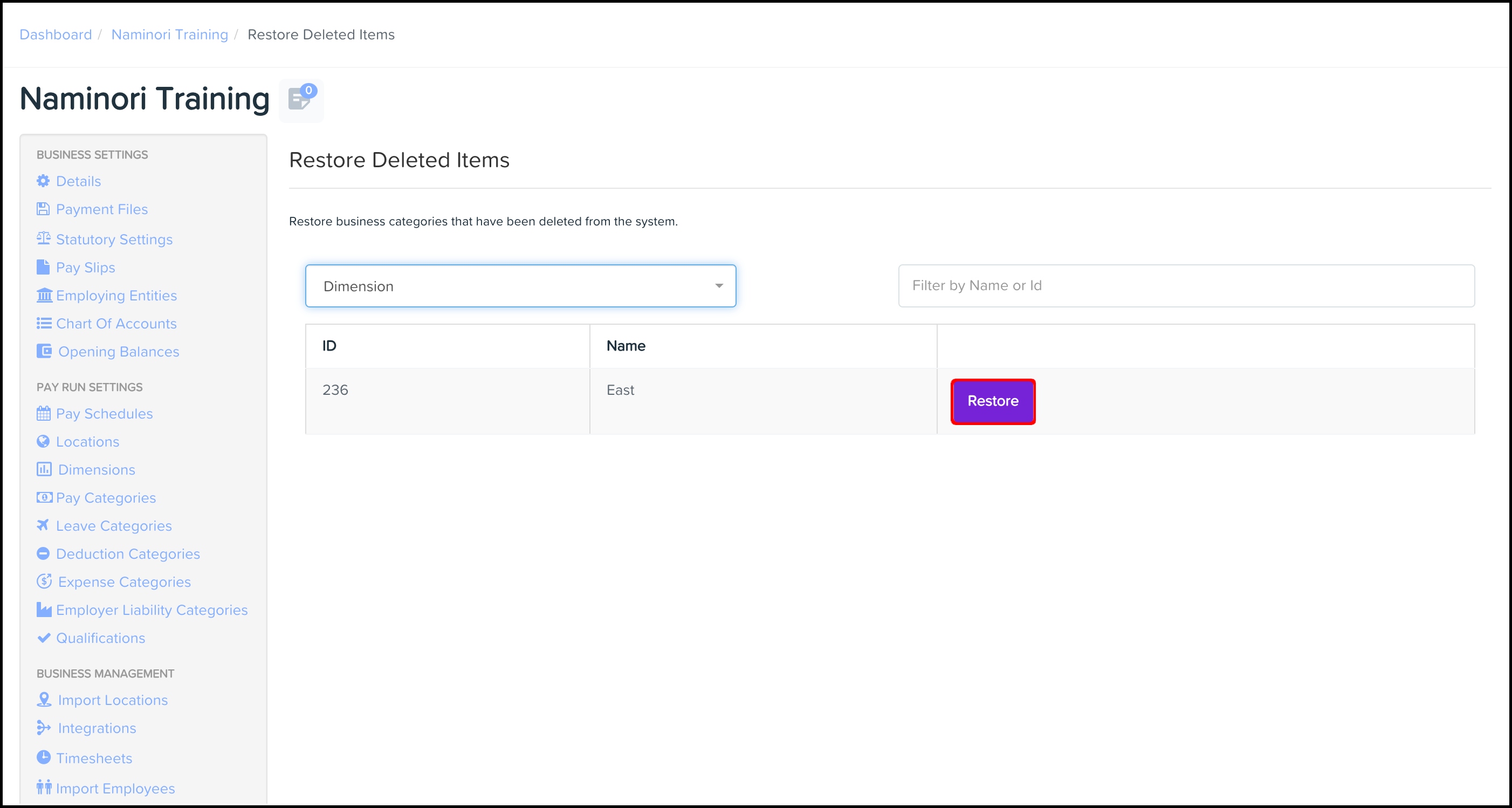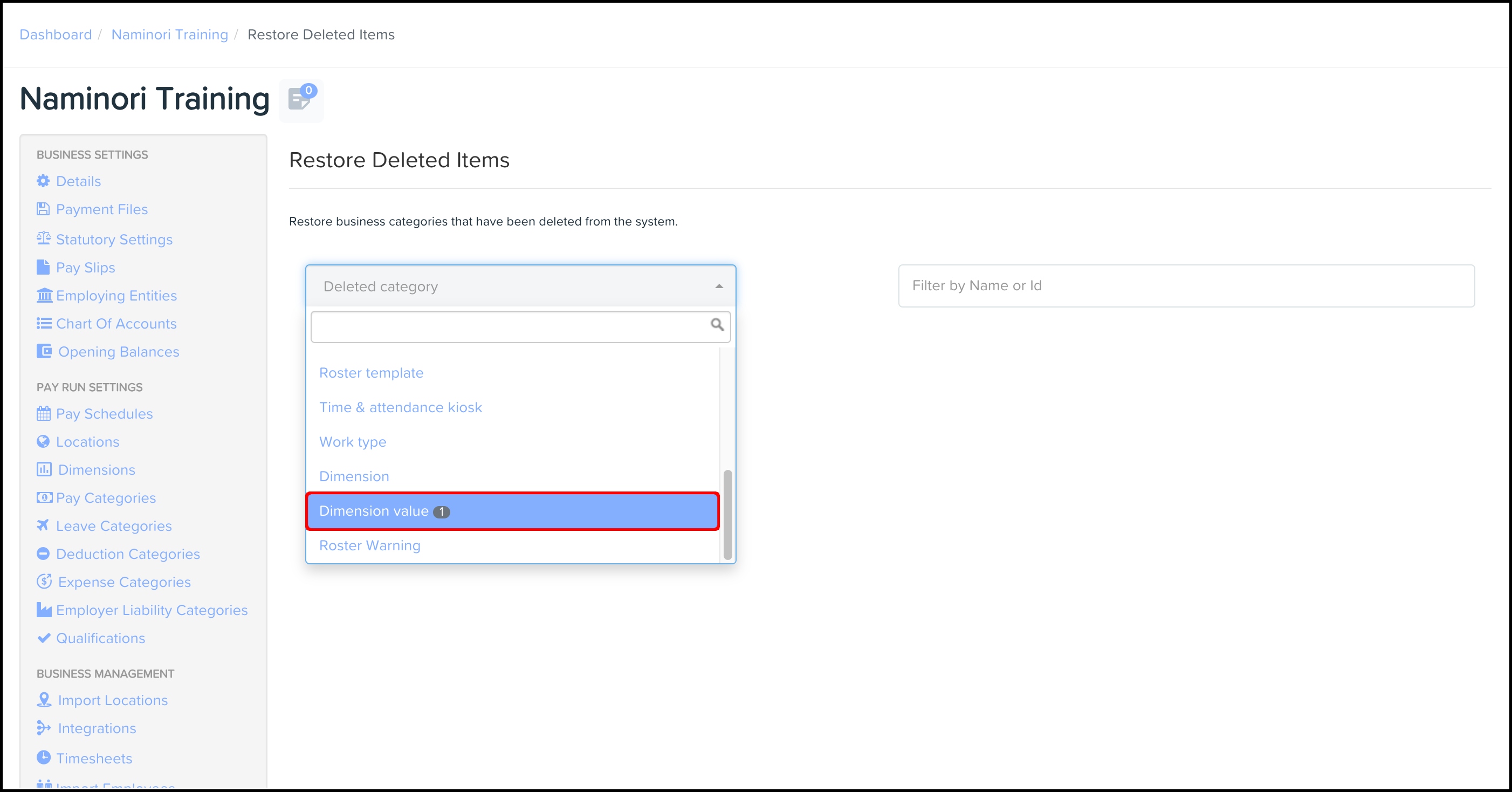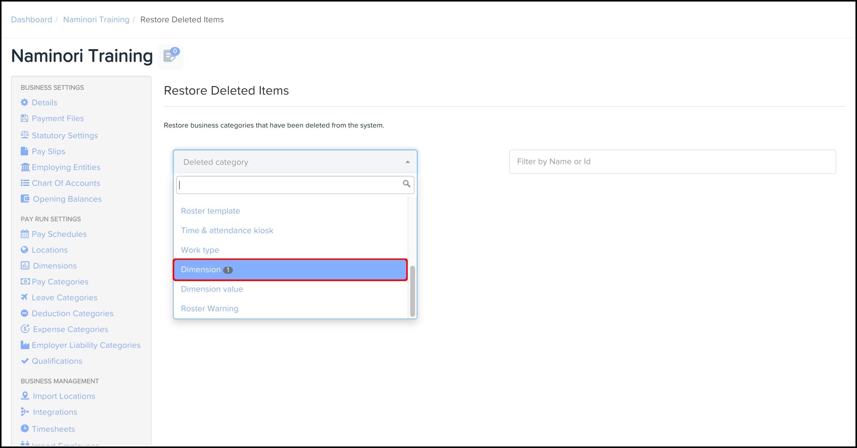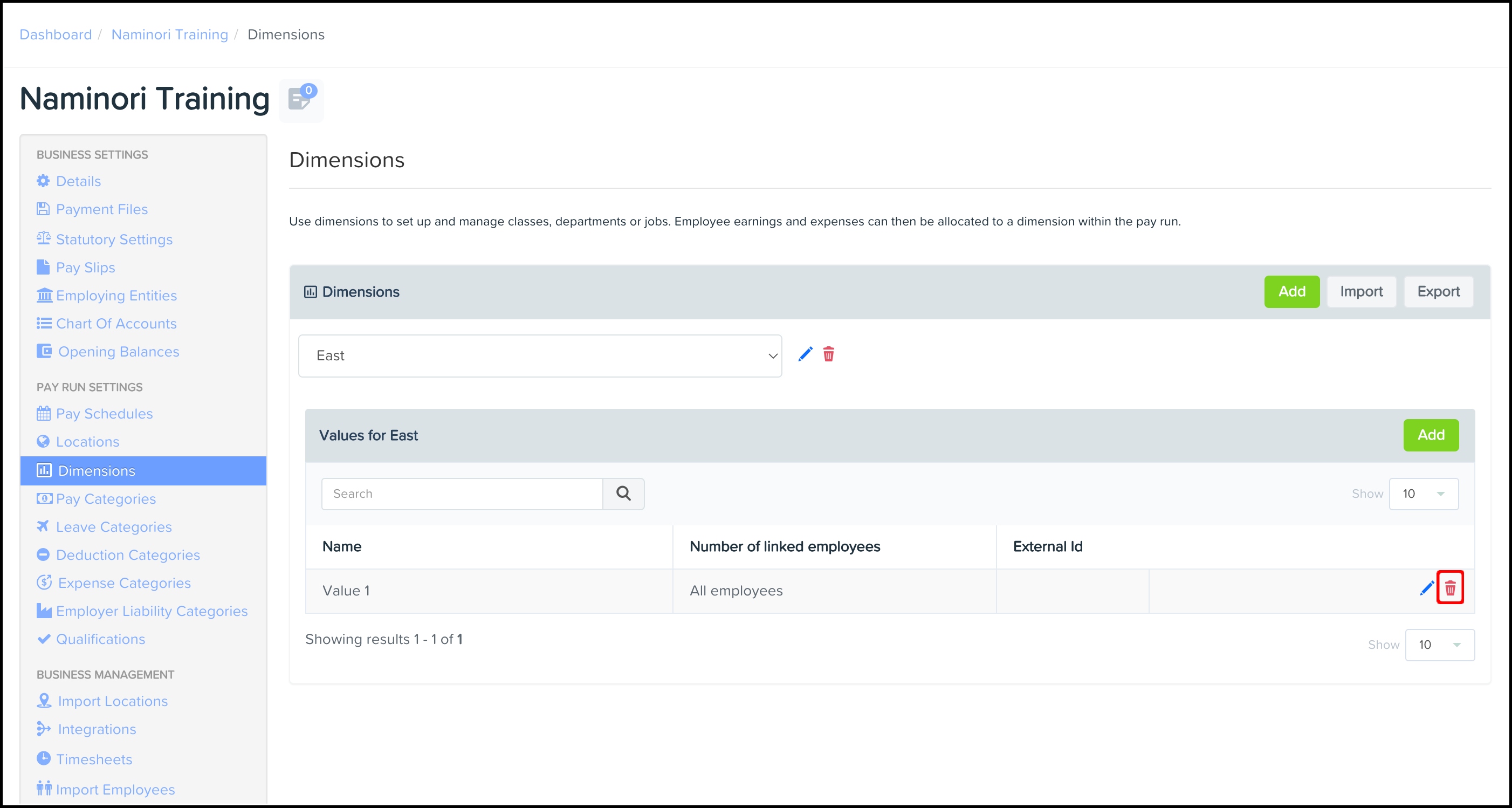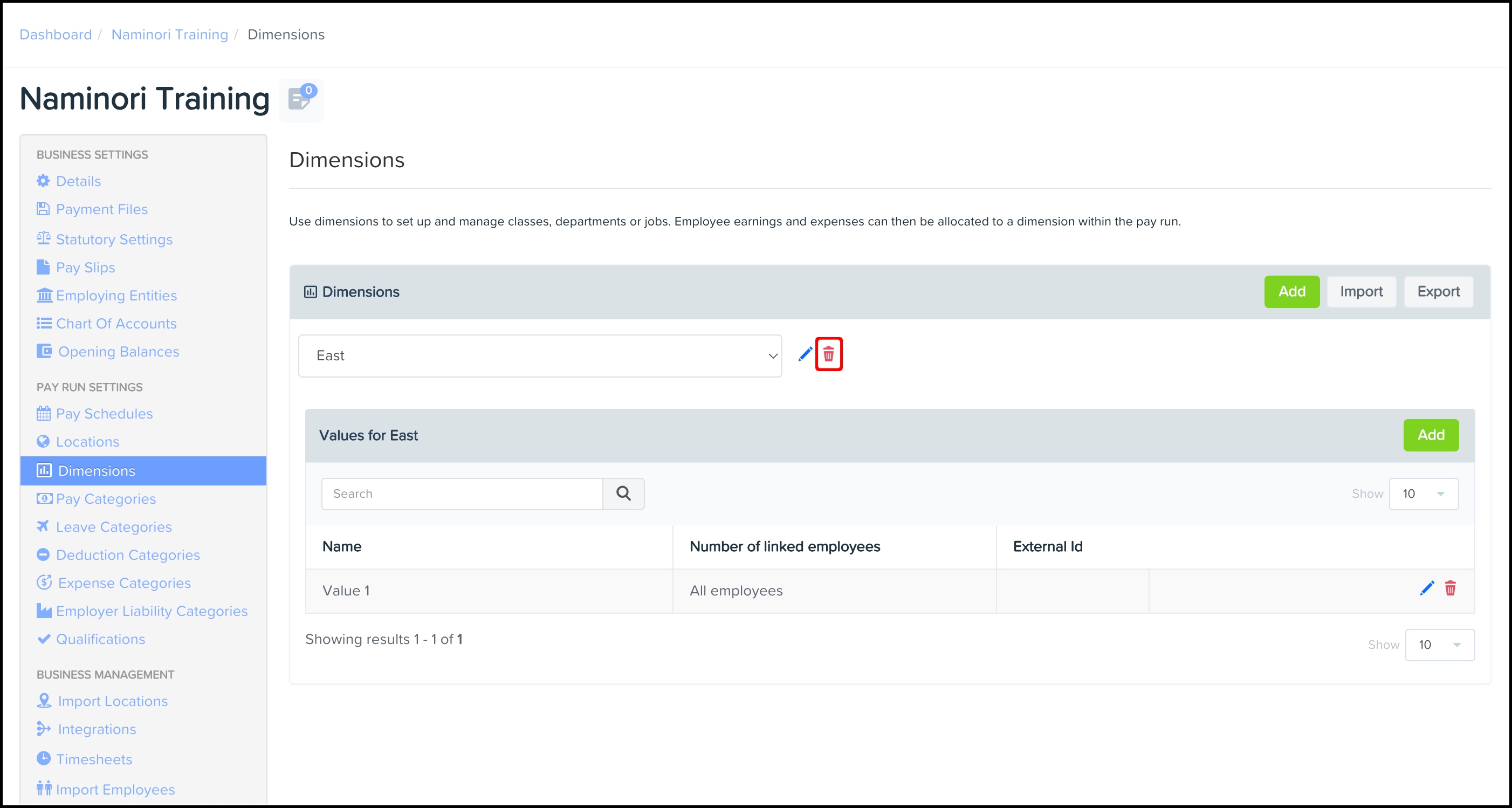 Deleting dimensions will not remove them from historic pay run data or payroll journals. However, the deleted dimension and its associated dimension values will not be available anymore to assign in pay runs moving forward.