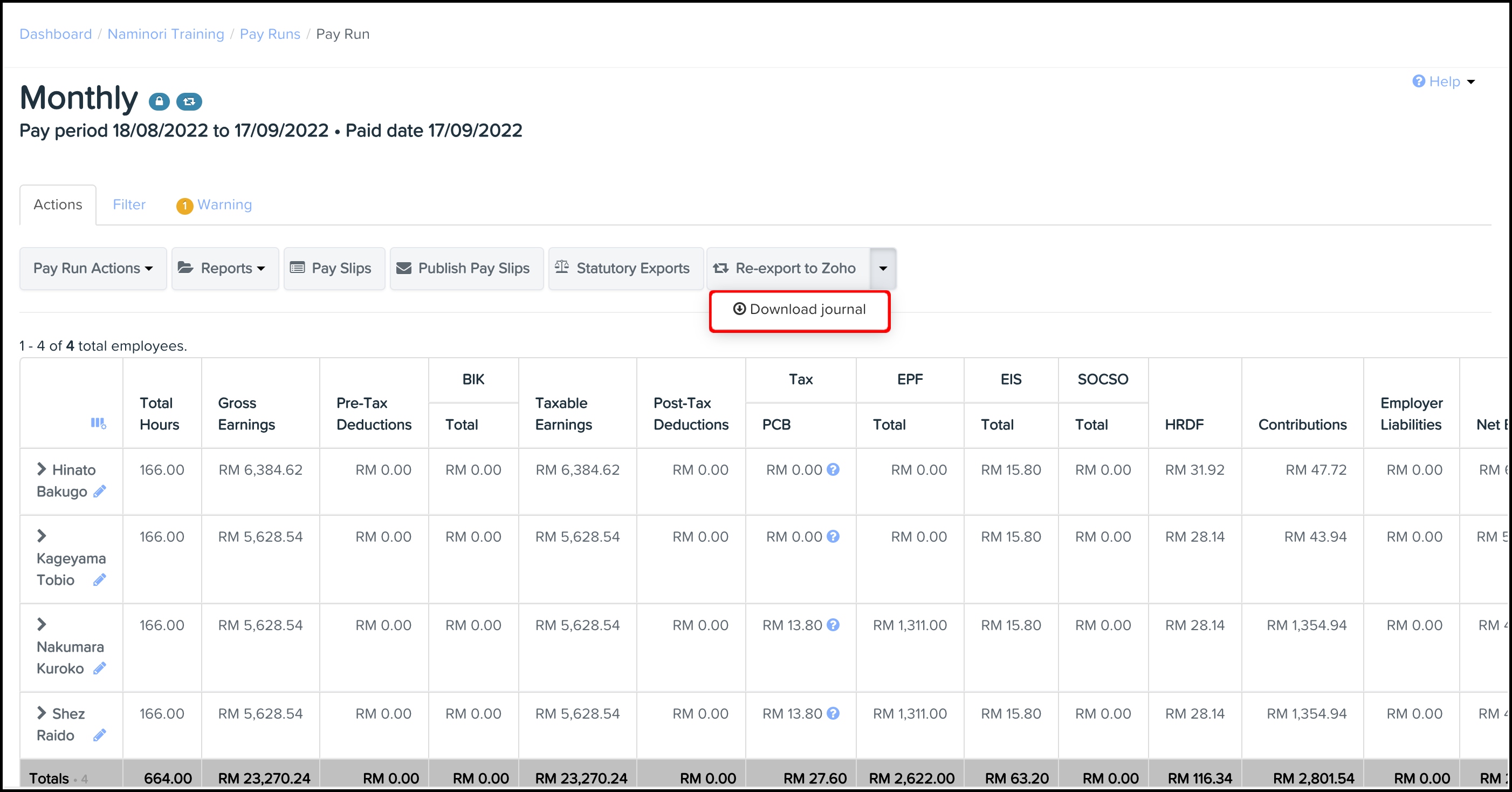 Businesses that are currently connected to another accounting/journal service can export the dimension data from the Download journal button in a finalised pay run.