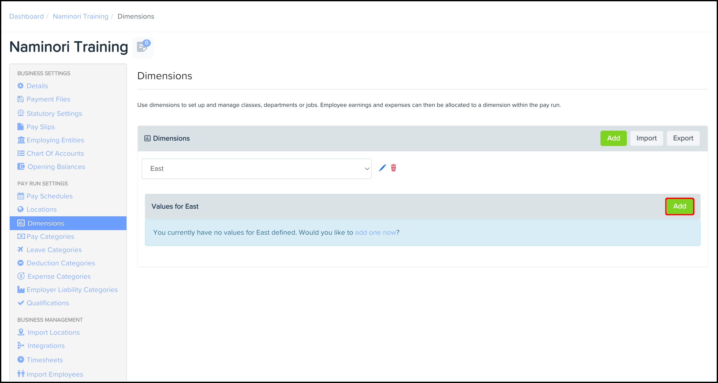 This will automatically import all dimensions data created from within the Business Central account connected to the payroll account (via the Integrations screen), including the code and external id.