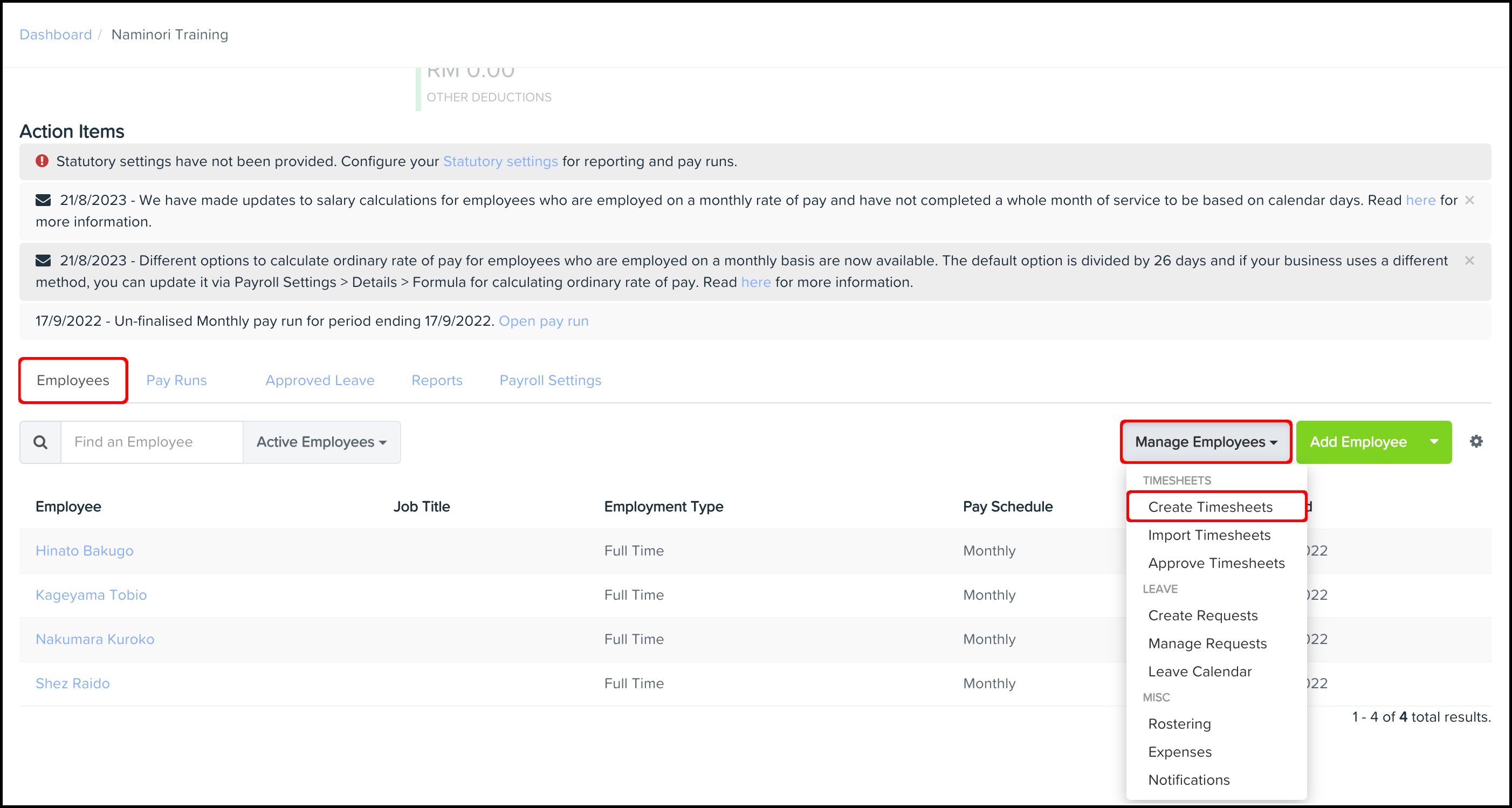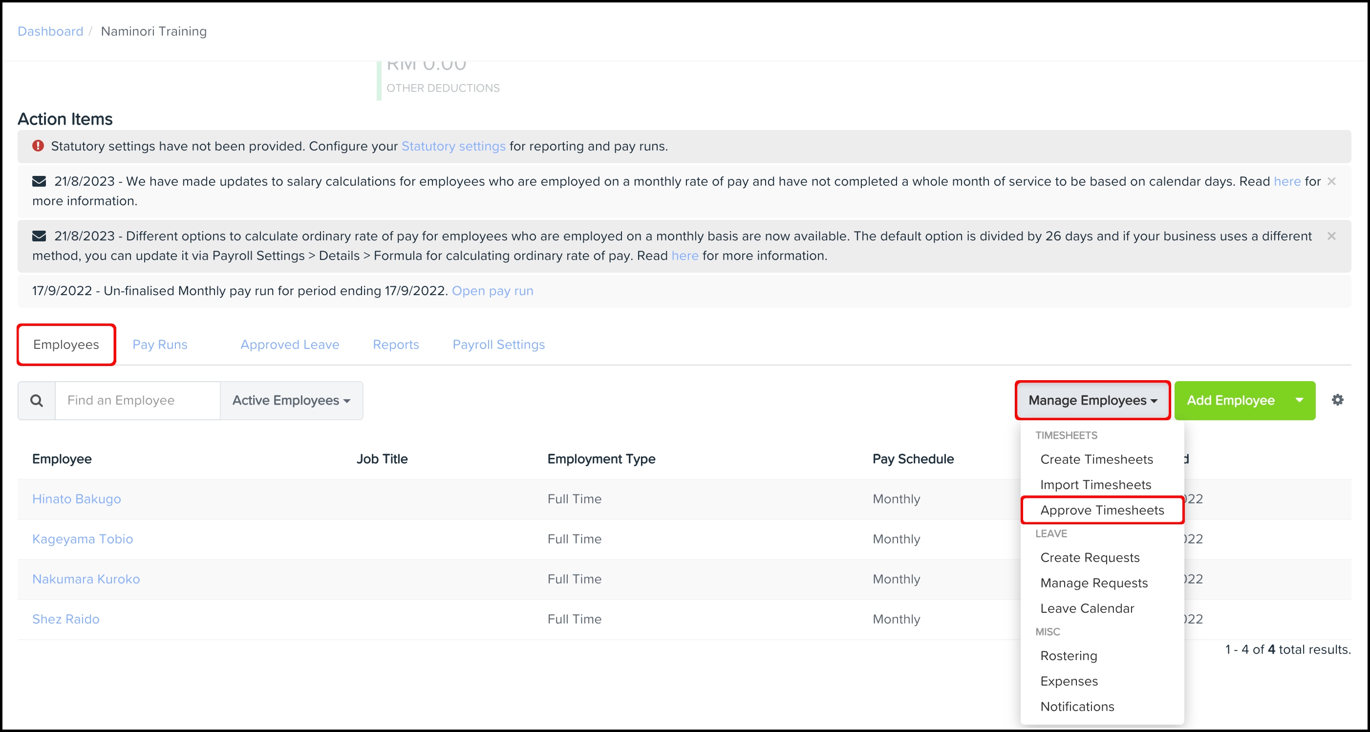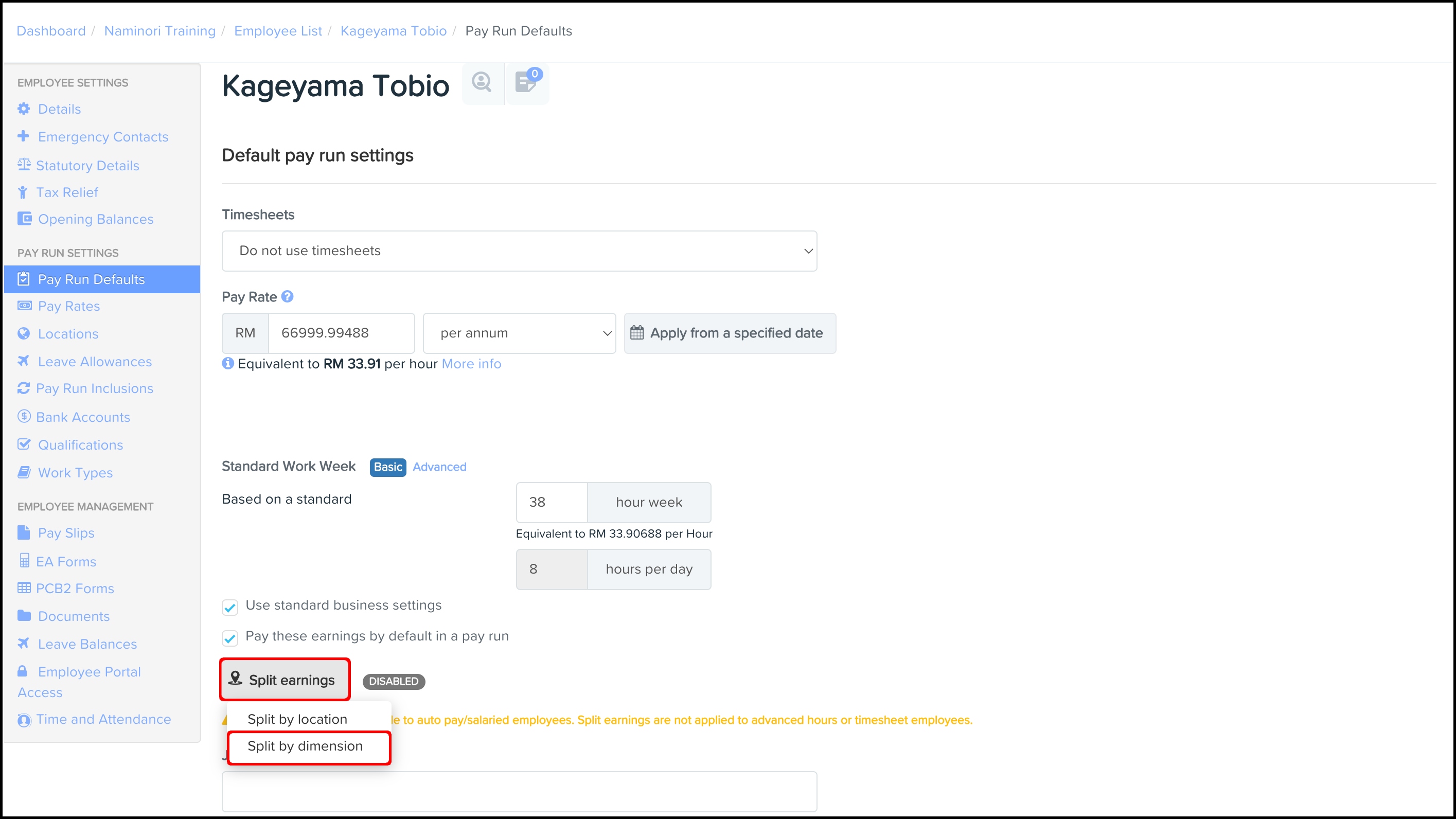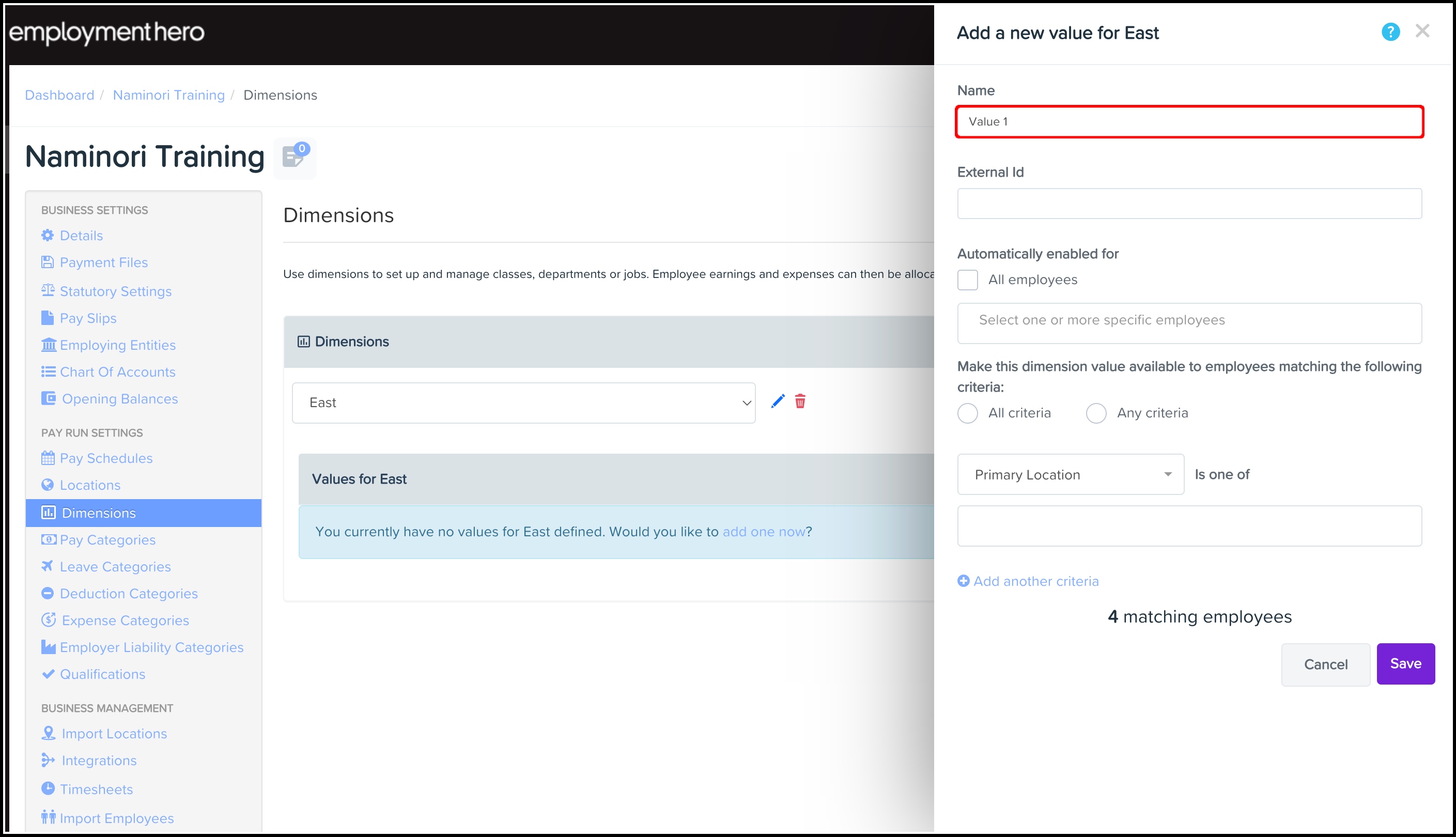 This affects what dimension values are made available for an employee's record to configure % earnings split, primary dimensions, and dimensions that can be assigned to the employee’s pay run earnings and expenses.