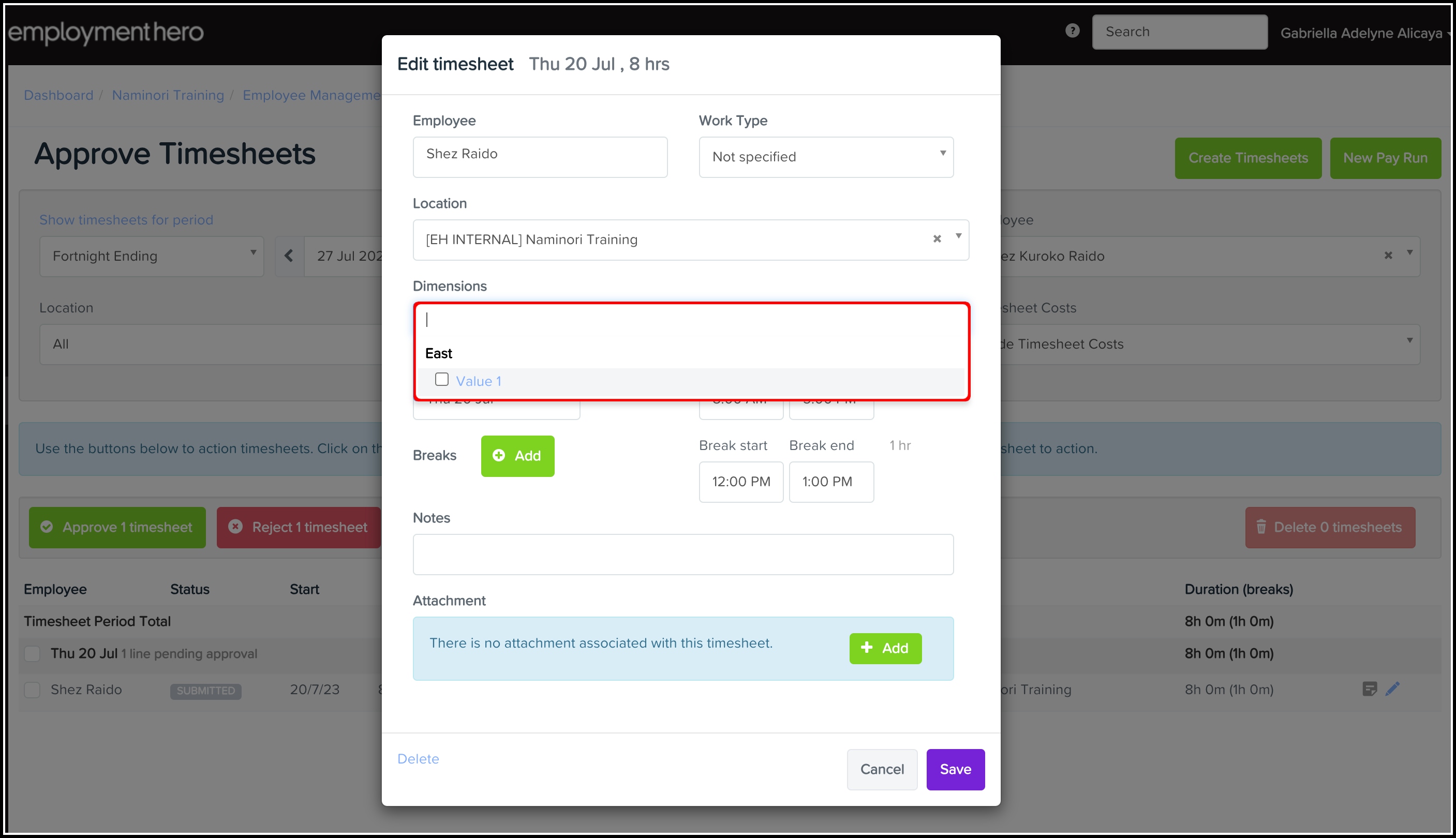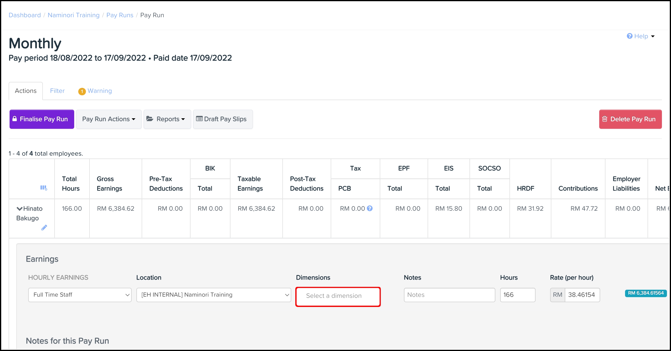 You can assign default dimension values to an employee similar to how you can assign a default primary location to them, but this is optional. Any earnings and expenses created within the pay run will automatically assign those dimension values.