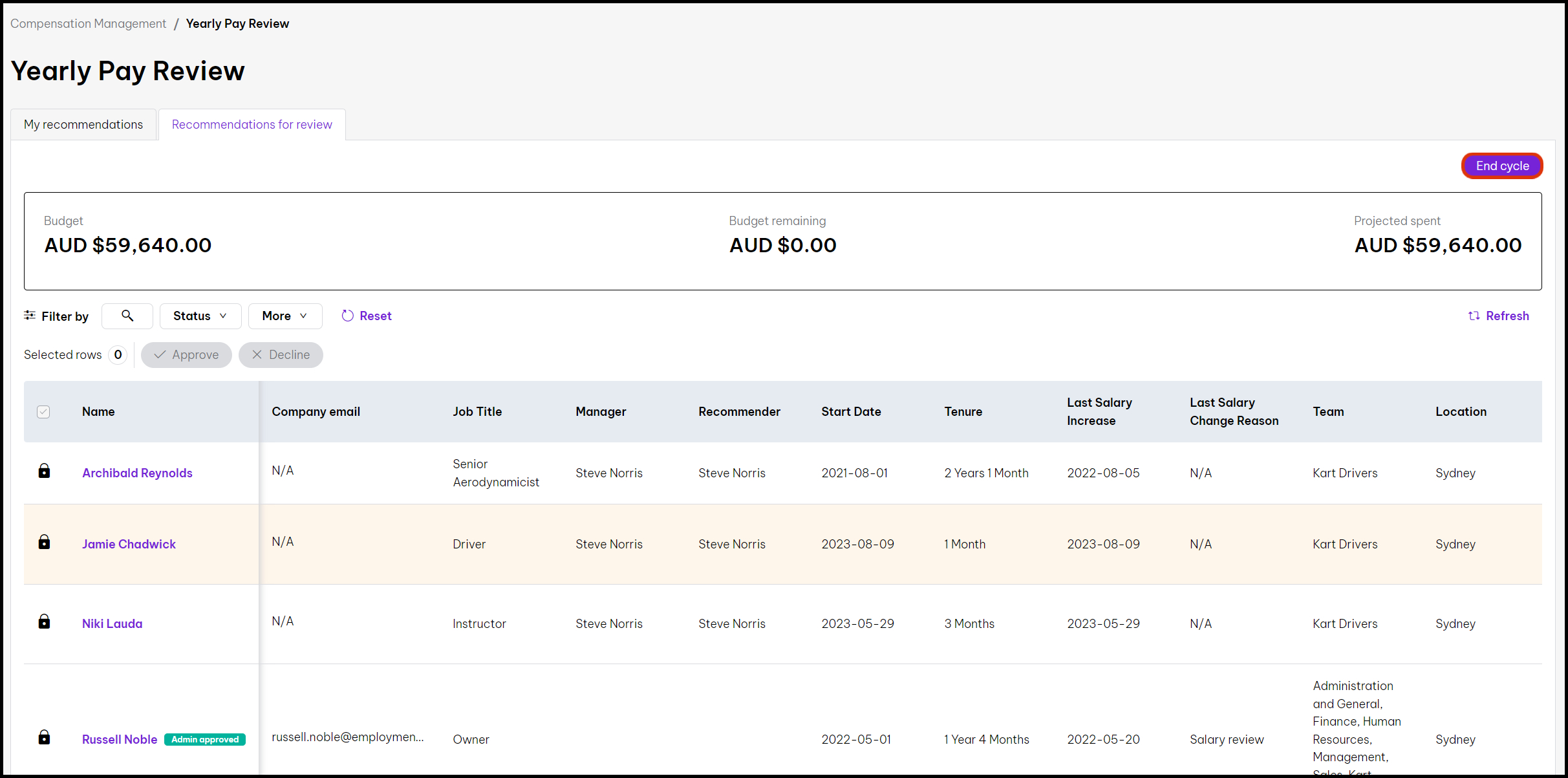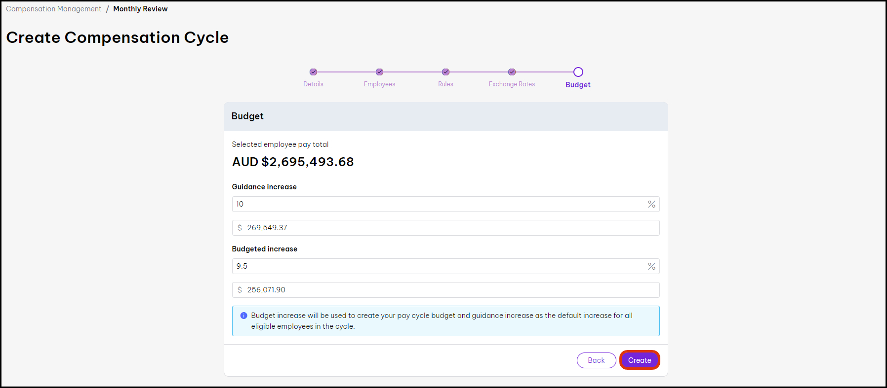 - Select the allocated/additional budget for the compensation review, based on the employees selected.
