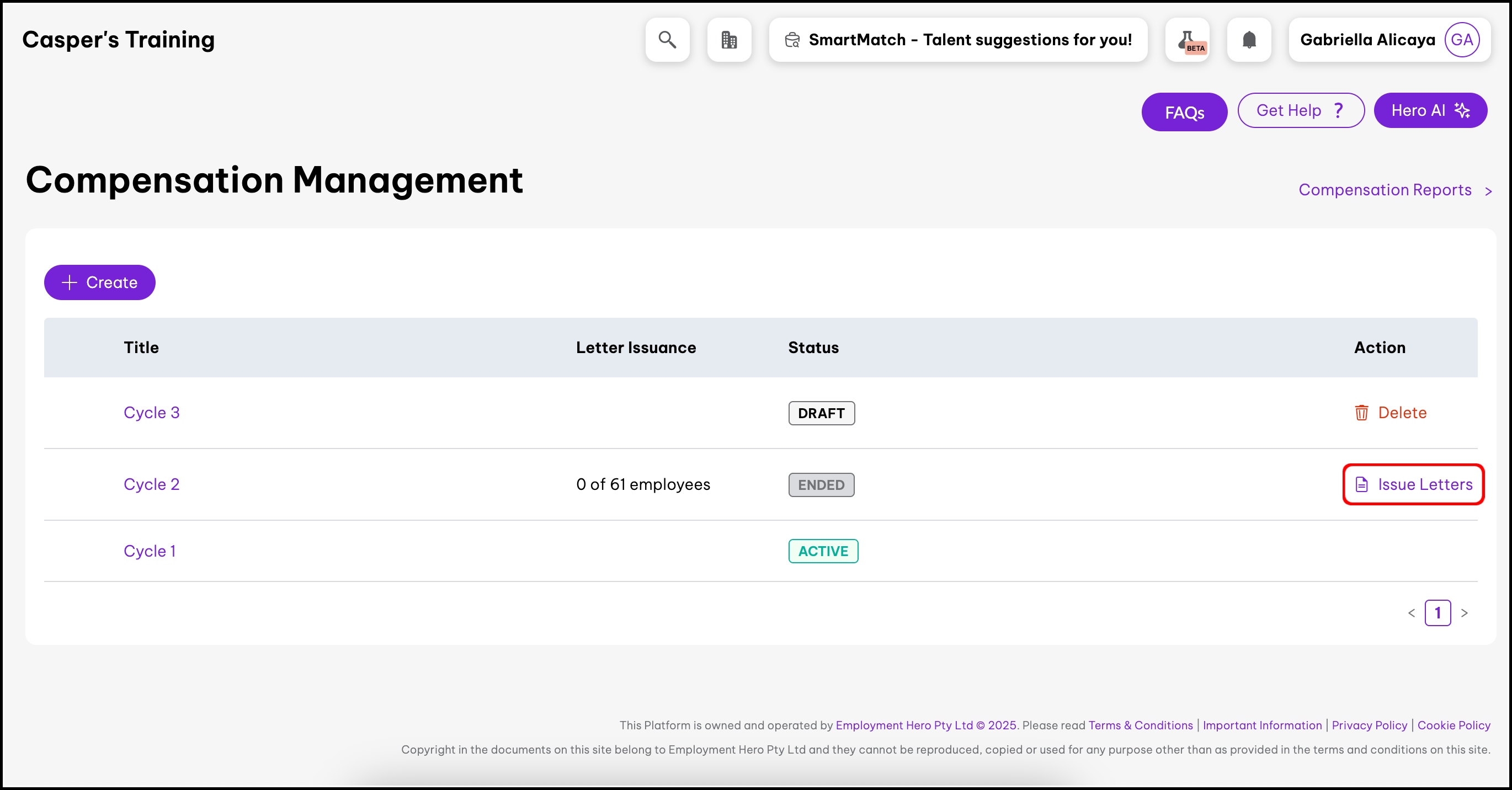 - Click the Issue Letters button for the finished compensation cycle you need.