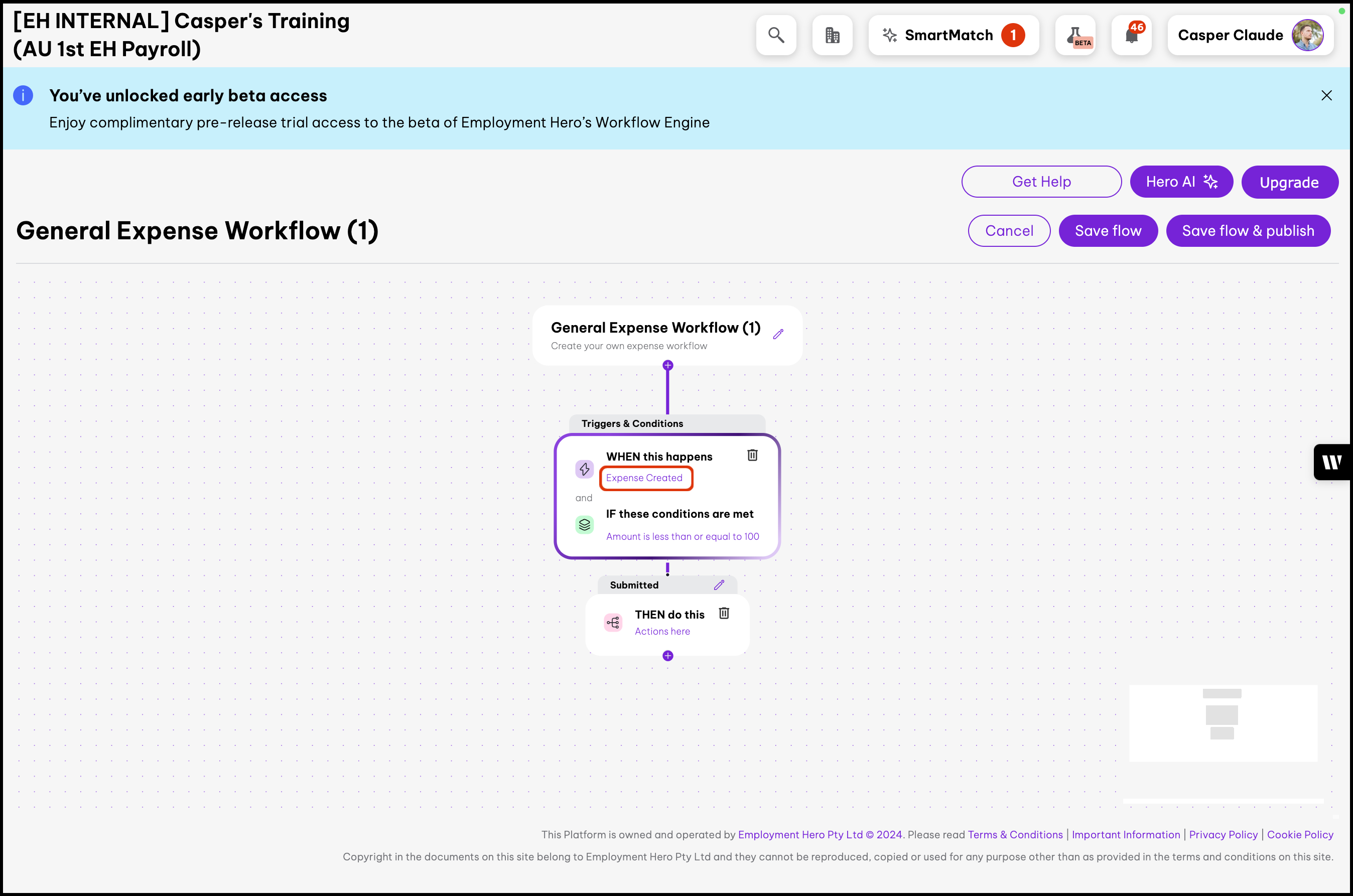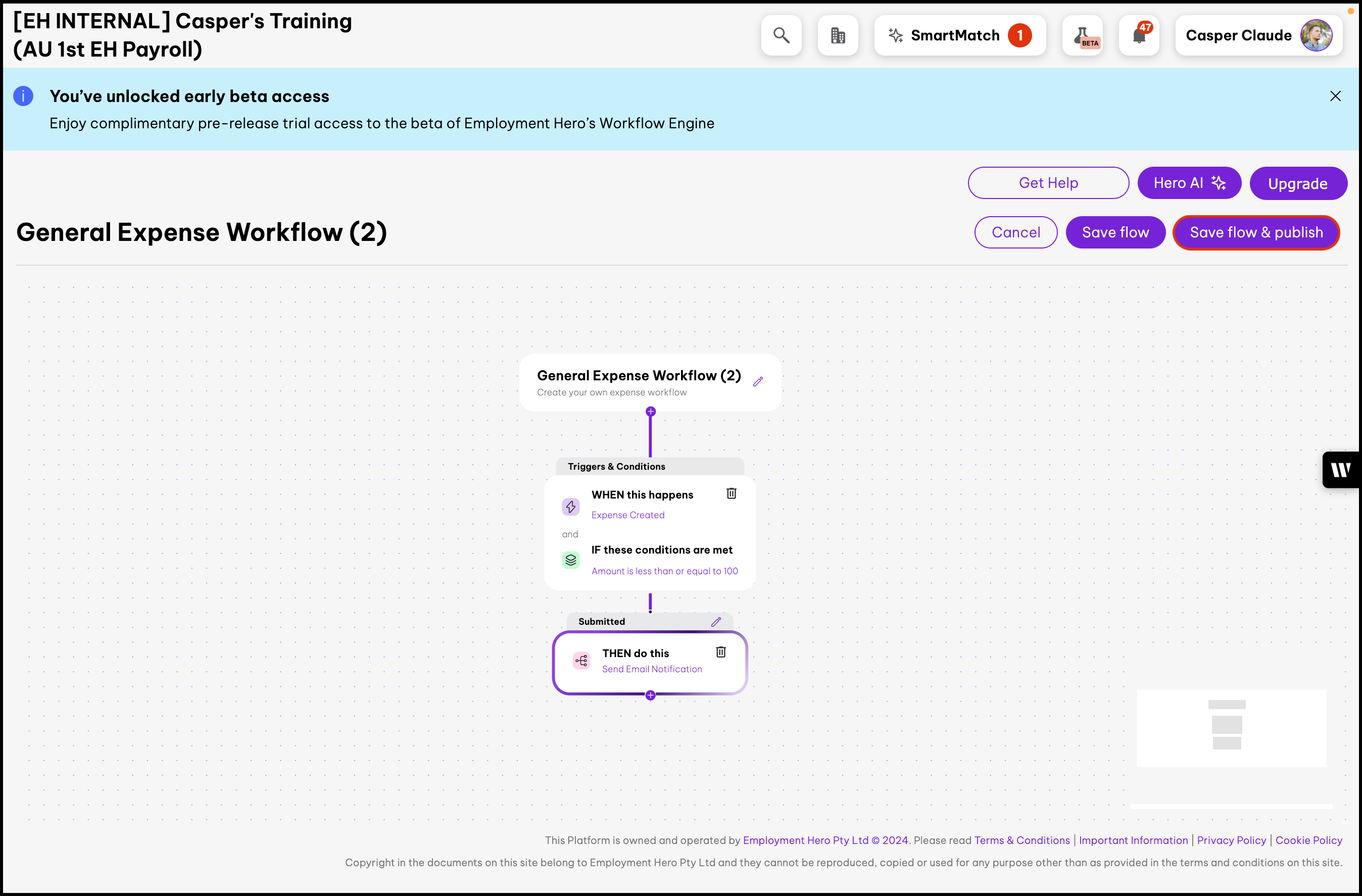 This feature allows you to customise expense approvals to suit your organisation's needs. By unpublishing the default workflow, you can then create your own expense workflow that aligns with your approval hierarchies.