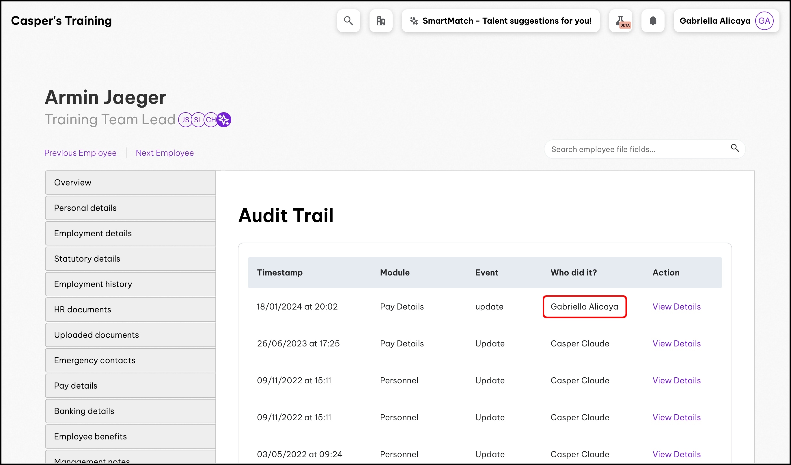 In this example, admin Gabriella Alicaya changed the pay details for employee Armin Jaeger. On the HR platform, the "Who did it?" column (in the Audit Trail tab in the Employee File) will show the name of the person who made the change.
