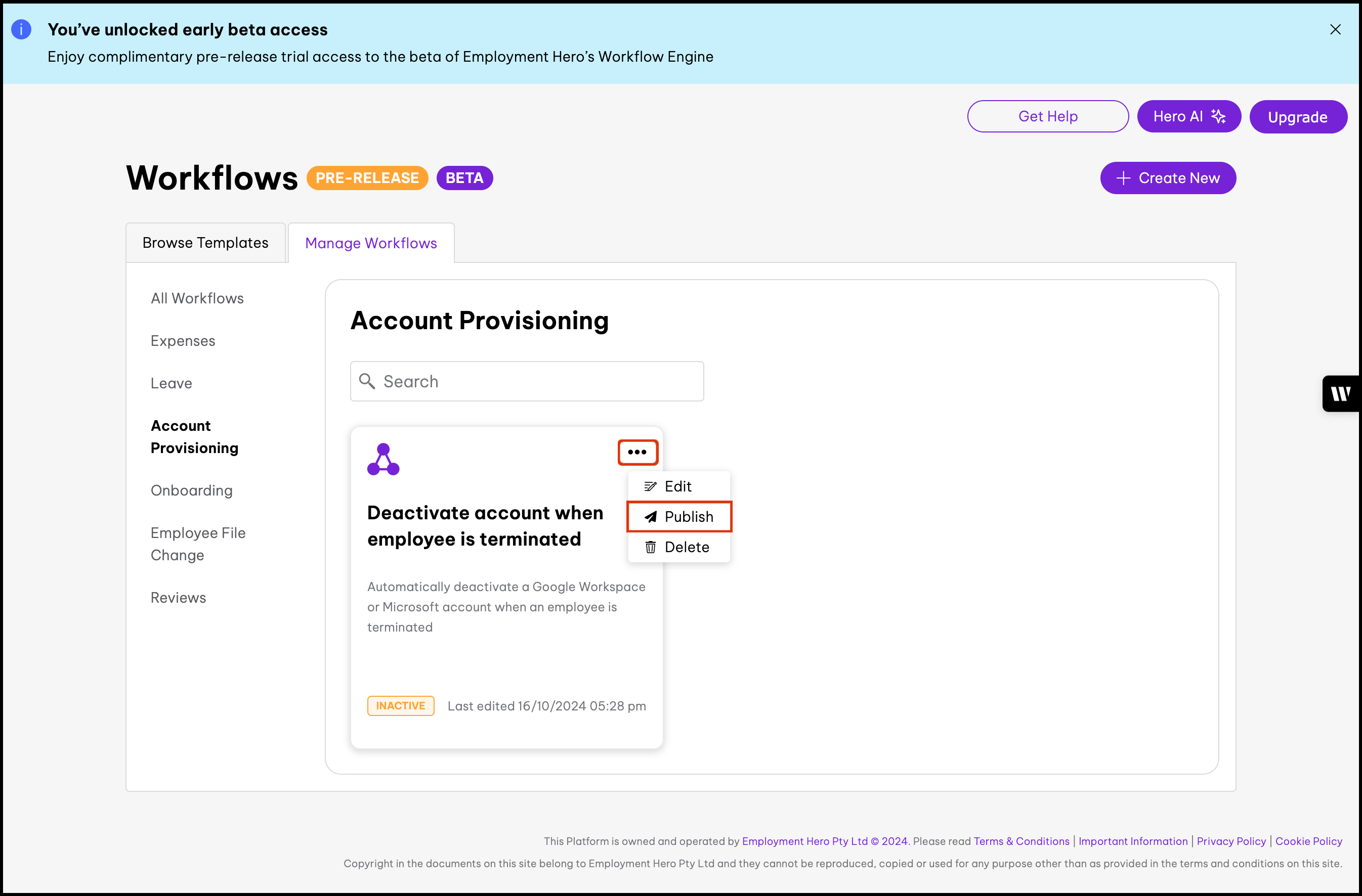 The Account Provisioning Workflows feature lets admins create workflows to automate the creation and deactivation of Google Workspace or Microsoft 365 accounts. Specifically, it can automatically create accounts for starting employees and deactivate accounts for terminated employees. Before you can use Account Provisioning Workflows, you first have to set up account provisioning on the platform. To learn more about this process, please refer to the following articles: