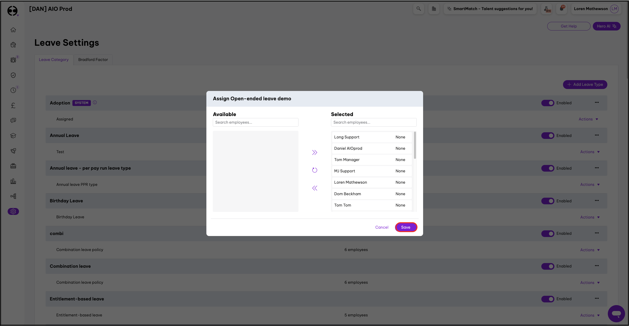 - To assign the policy to certain employees, drag their name from the Available column to the Selected column.