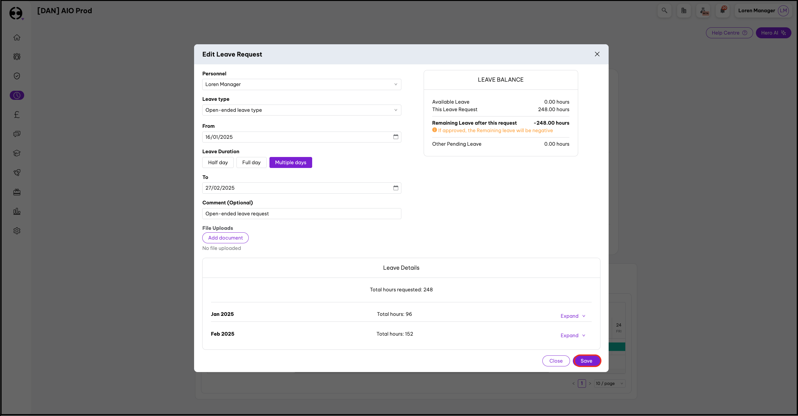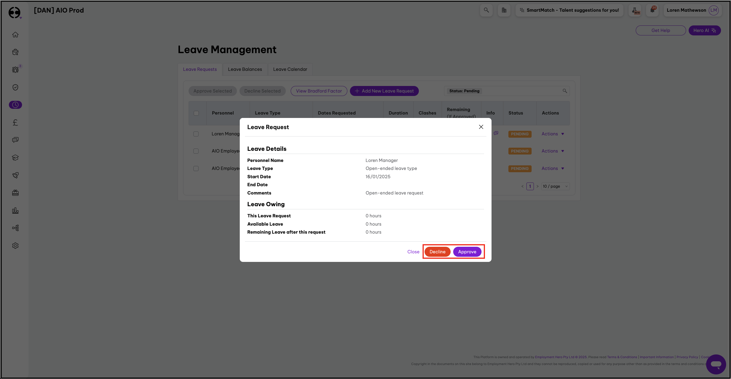 - Find the employee with the open-ended leave request. Ensure that the end date of the leave is the last day of the pay run and the request has the end date that the employee has now added to Employment Hero.
