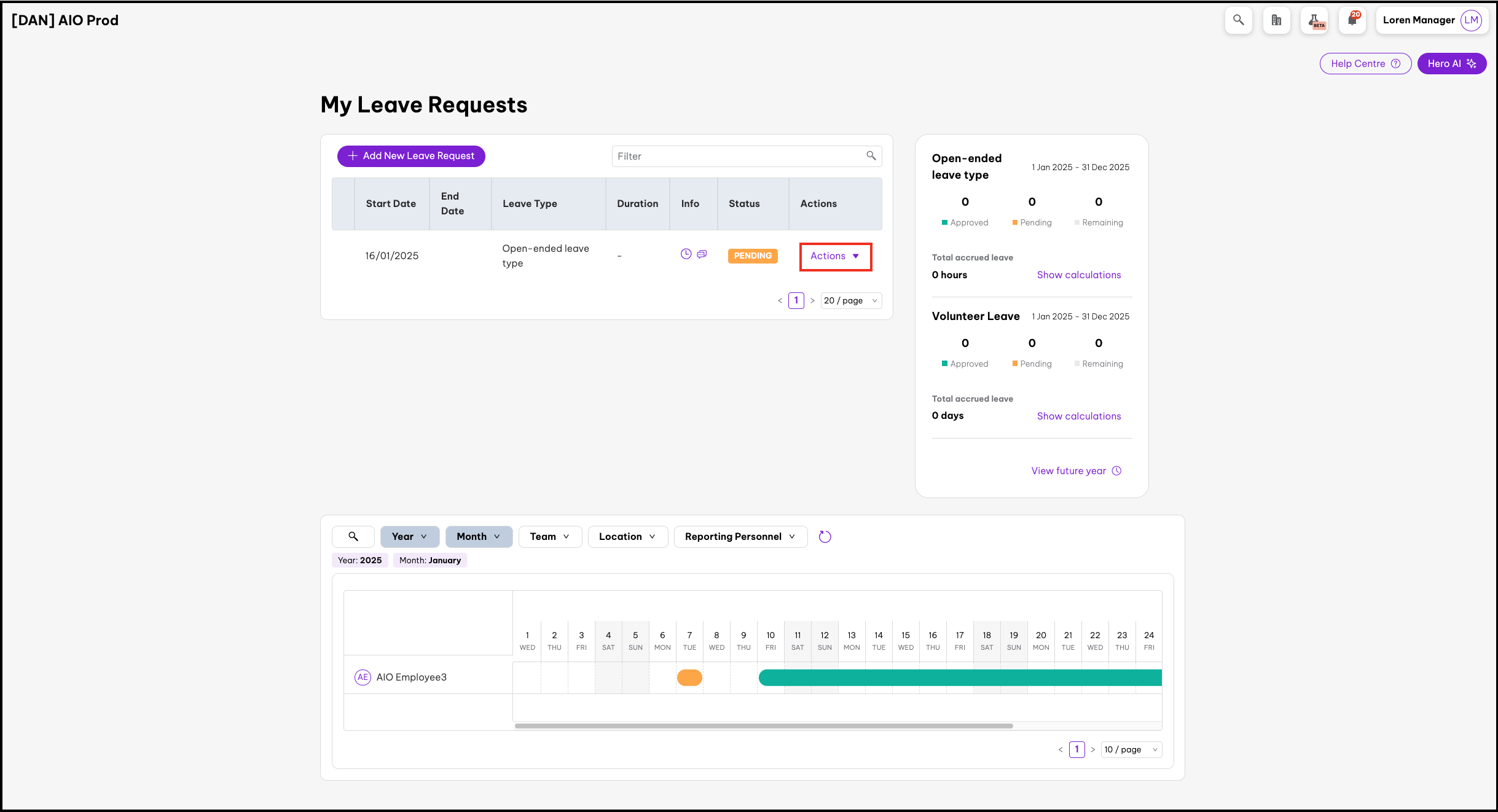 - On the entry by the employee with the open-ended leave request, click on Actions.
