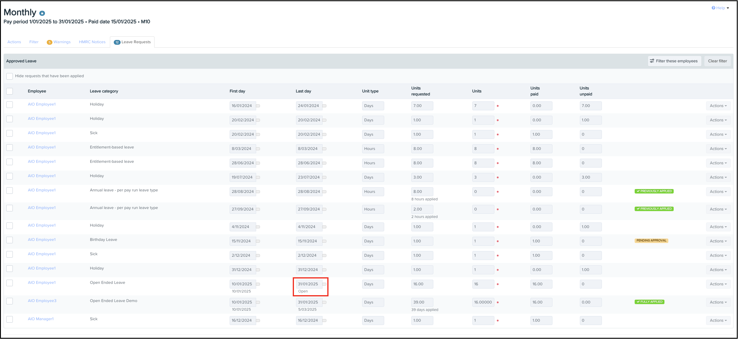- Find the employee with the open-ended leave request. Ensure that the end date of the leave is the last day of the pay run and the request says Open.