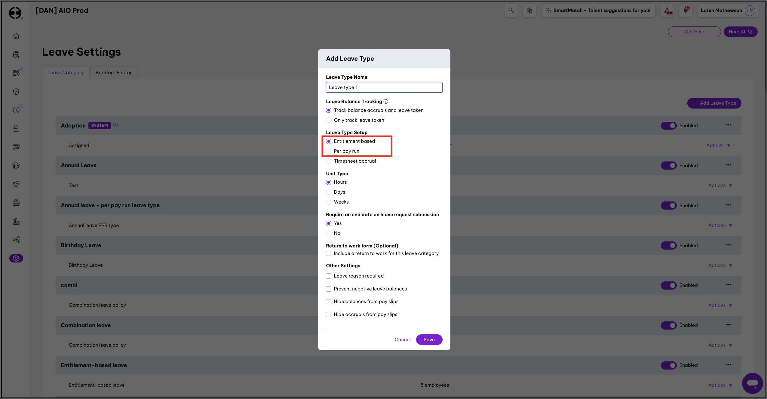- Leave Type Setup - to allow carry-over and forfeiture, you must choose Per pay run or Entitlement-based.