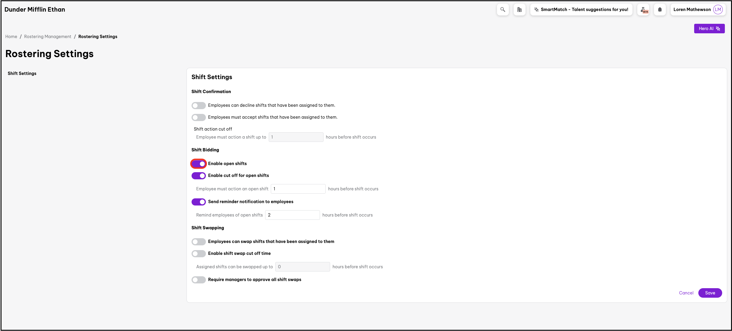 A manager or admin can create open shifts for employees to bid on. You are also able to set a shift bidding cut-off time, after which employees are no longer able to bid on the open shifts, and you can also set shift bidding notification reminders for your employees.