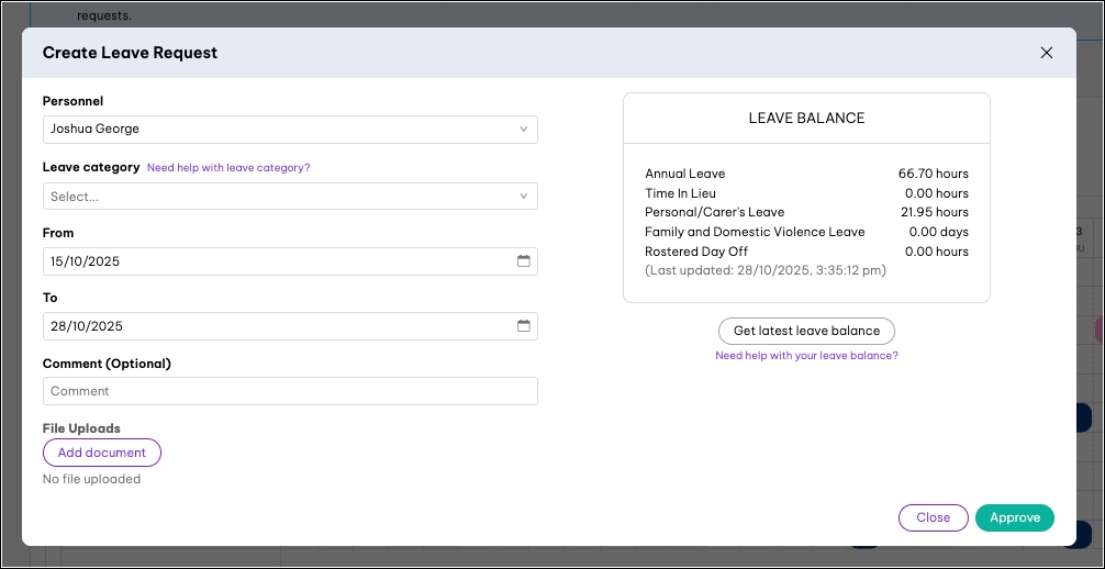 5. Remaining Leave: The calculation of remaining leave is Annual Leave + Accrued Leave - Approved Leave - This Leave Request.