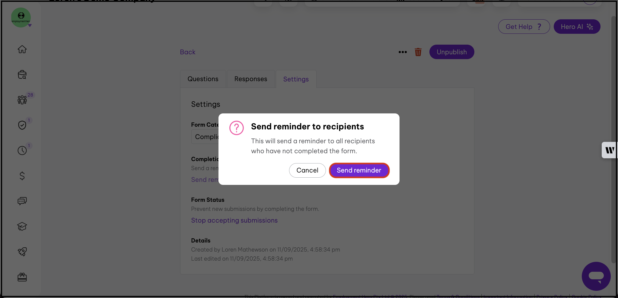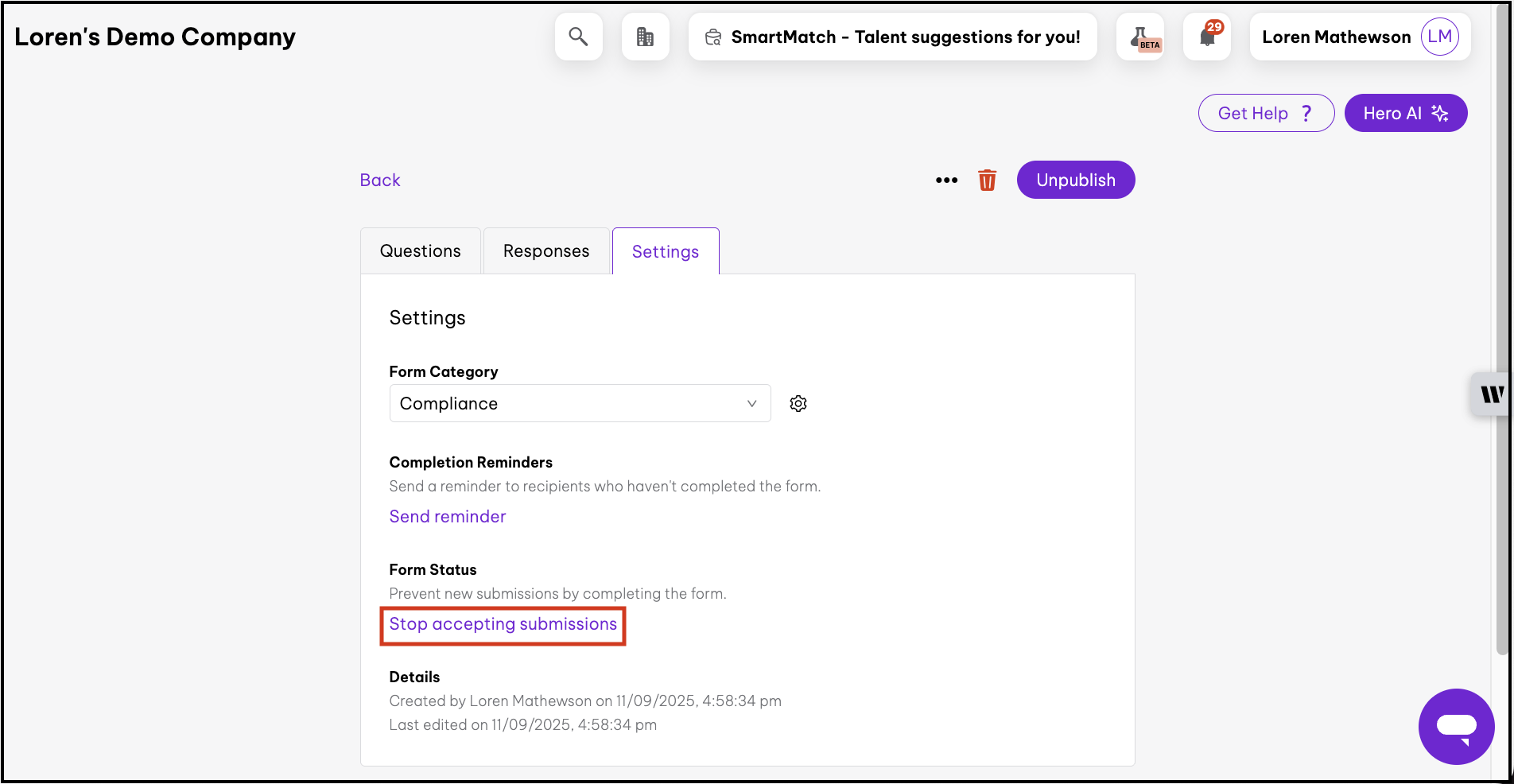 Unpublishing a form will remove it from the Company Forms library and remove any pending assignments from employees' To Do lists.