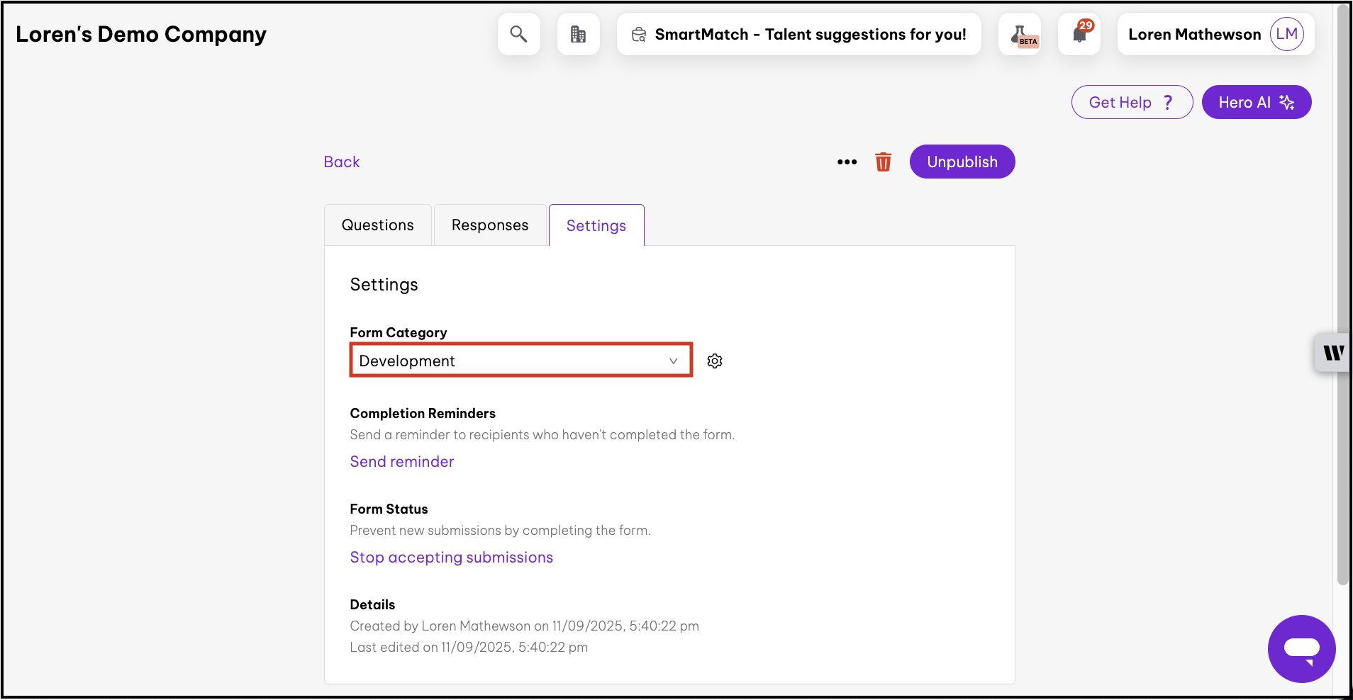 - Under the Settings tab, choose the category you want to add this form to from the drop-down menu.