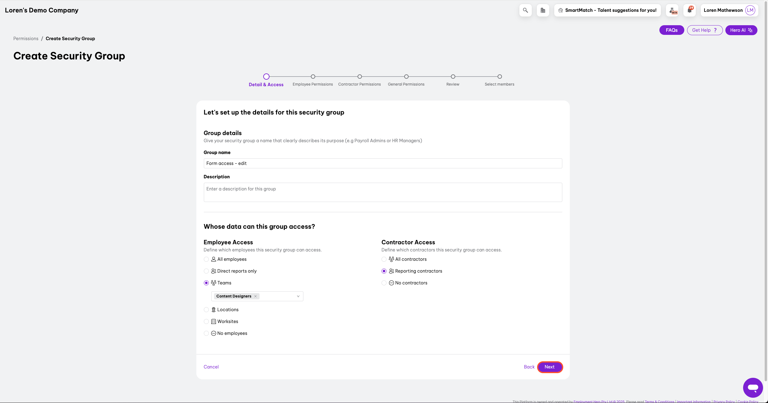 - In the Employee permissions window, click on Next in the bottom right-hand side.