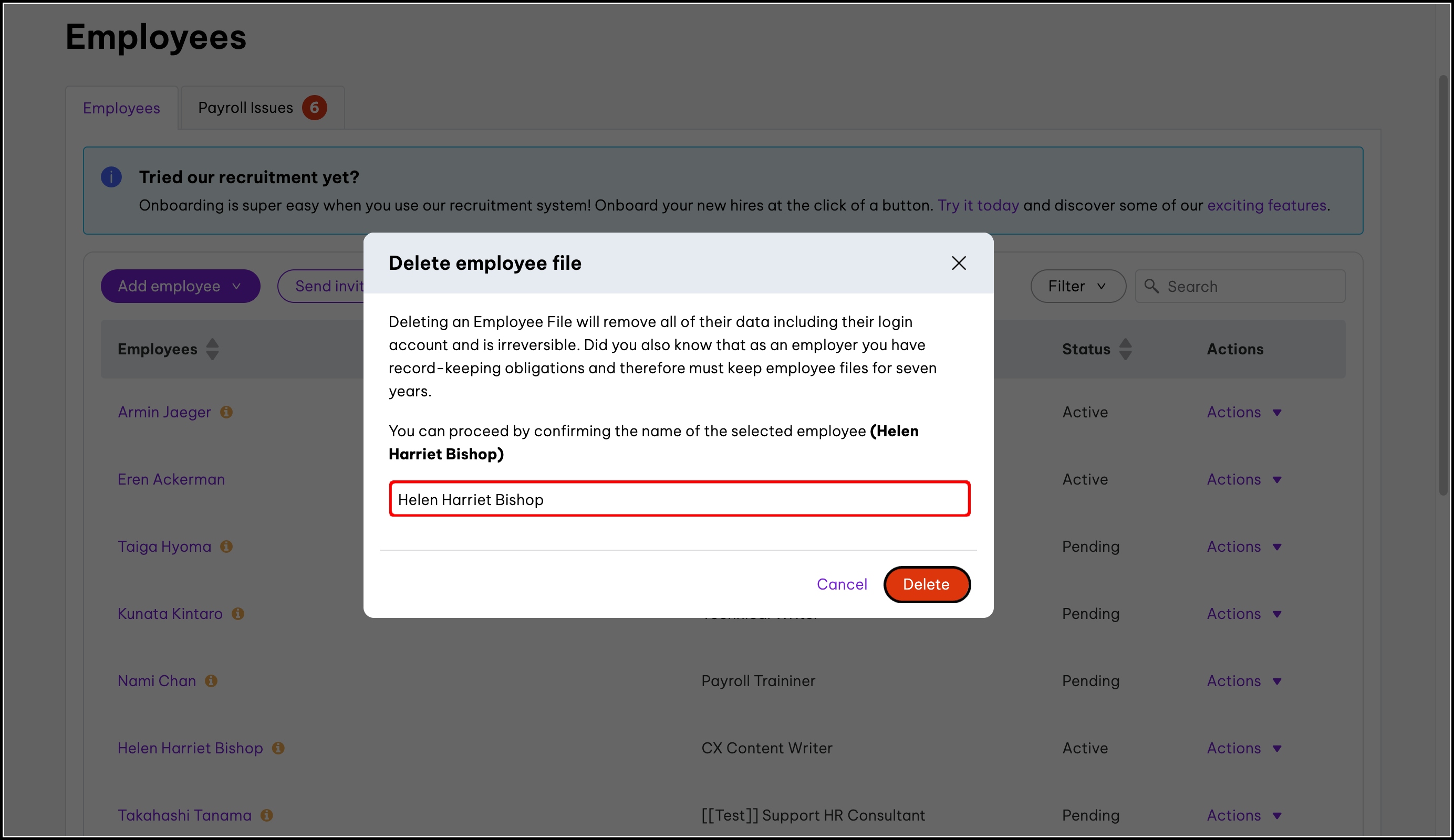 Please note that deleting an employee from your platform means you will not be able to reactivate their profile in the future. In case you want to hire them back, you will have to onboard them again from the start.