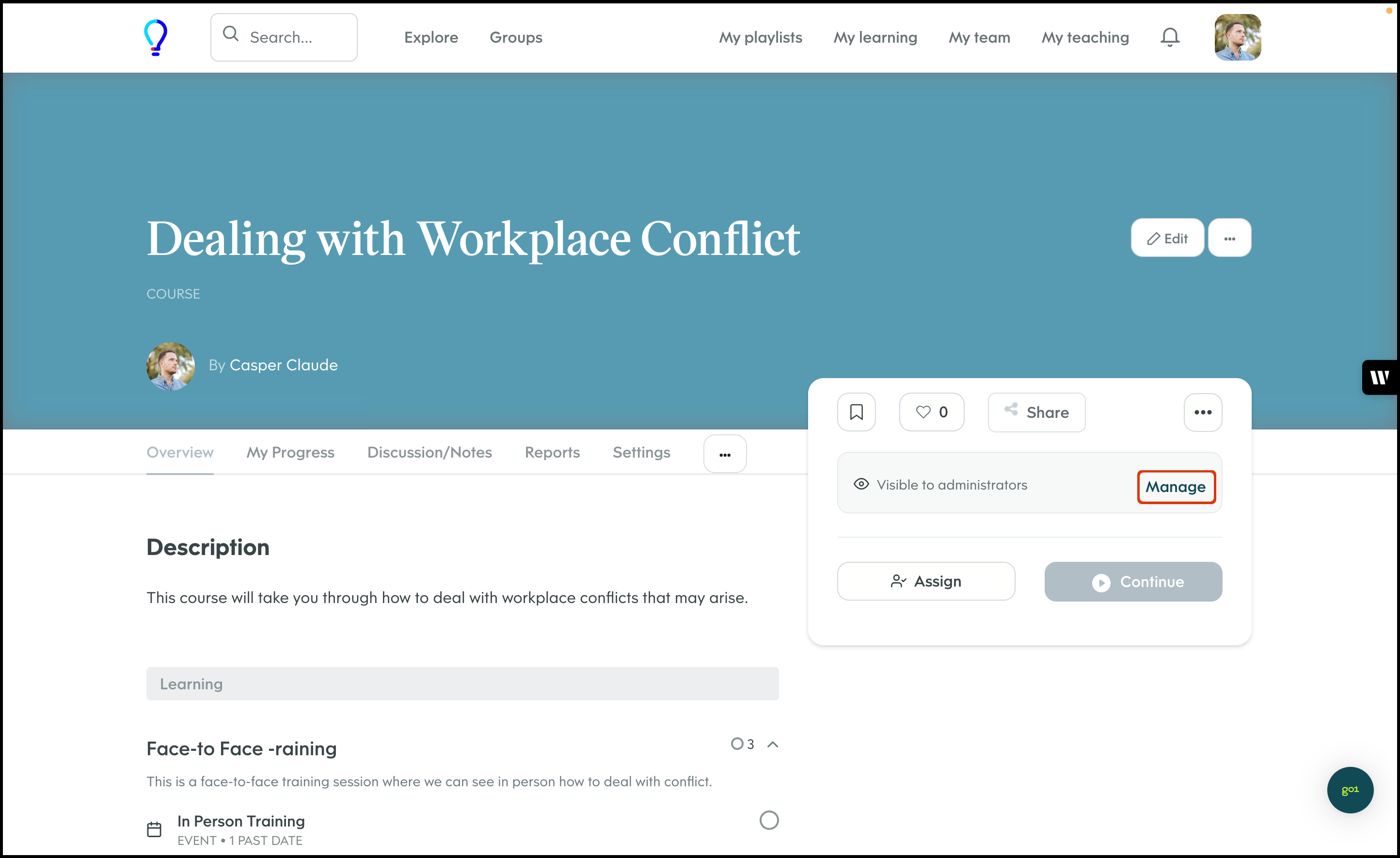 If you want to see the progress status of learners for a particular course, head to the Manage page. You will be able to see who has already been assigned learning and who is doing their own self-directed learning. The Manage page is available by searching for a course or resource through the search bar in the top navigation.
