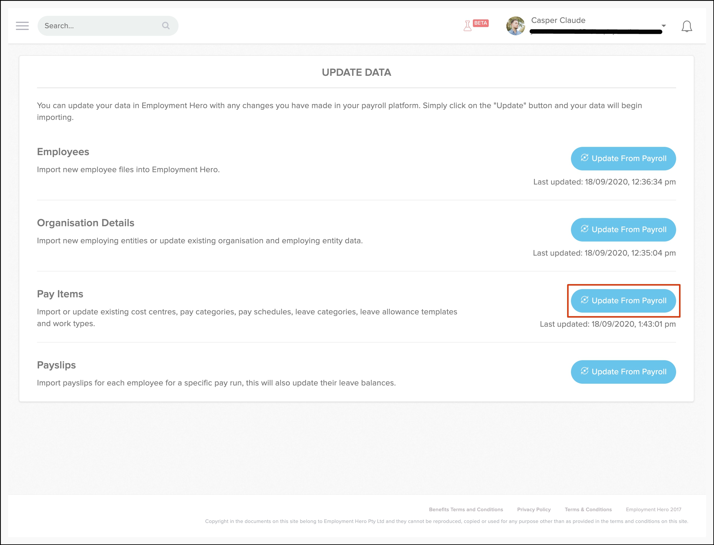 The Pay Items section will now show a Updated button. This means the Employment Hero platform has successfully imported your employees from your Payroll classic platform.