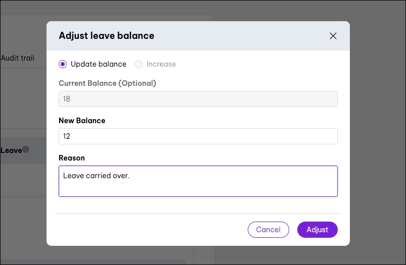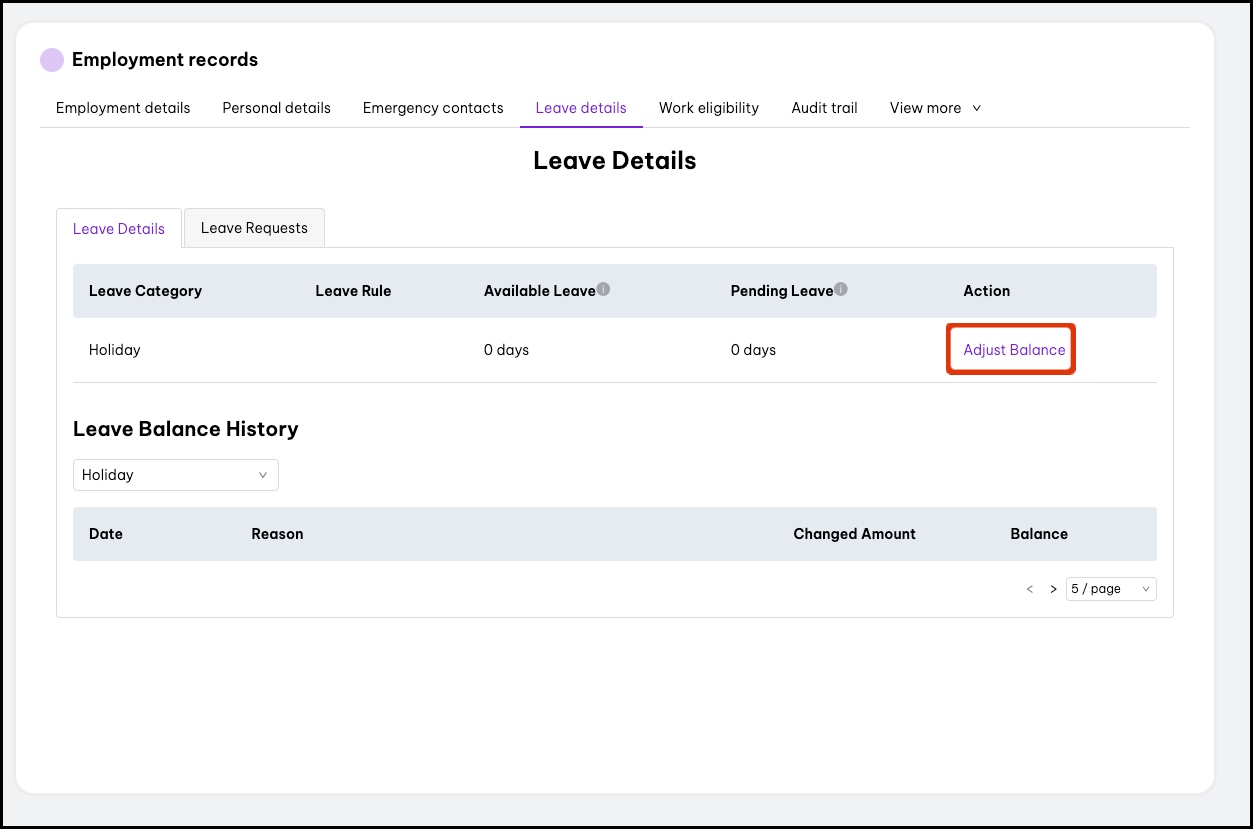 - Adjust leave balances: This feature allows you to adjust leave balances via the leave management feature.