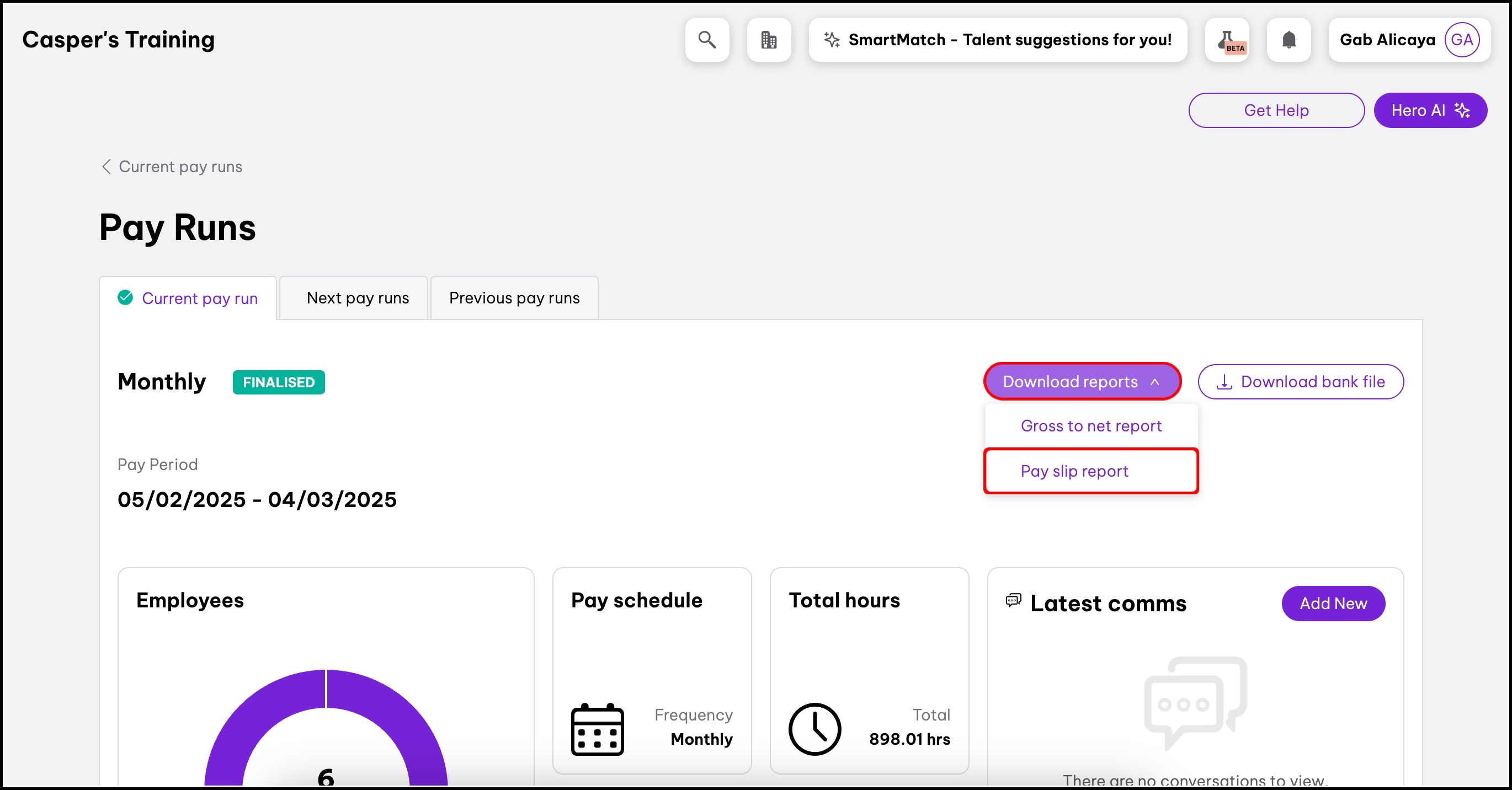 - Click Pay Slip Report. This will download a file containing the payslips for the employees included in that pay run.