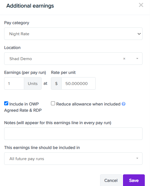 - Tick the 'Include in OWP Agreed Rate & RDP if required. (Tick this option on if this needs to be included in the employee base for OWP and RDP calculations.