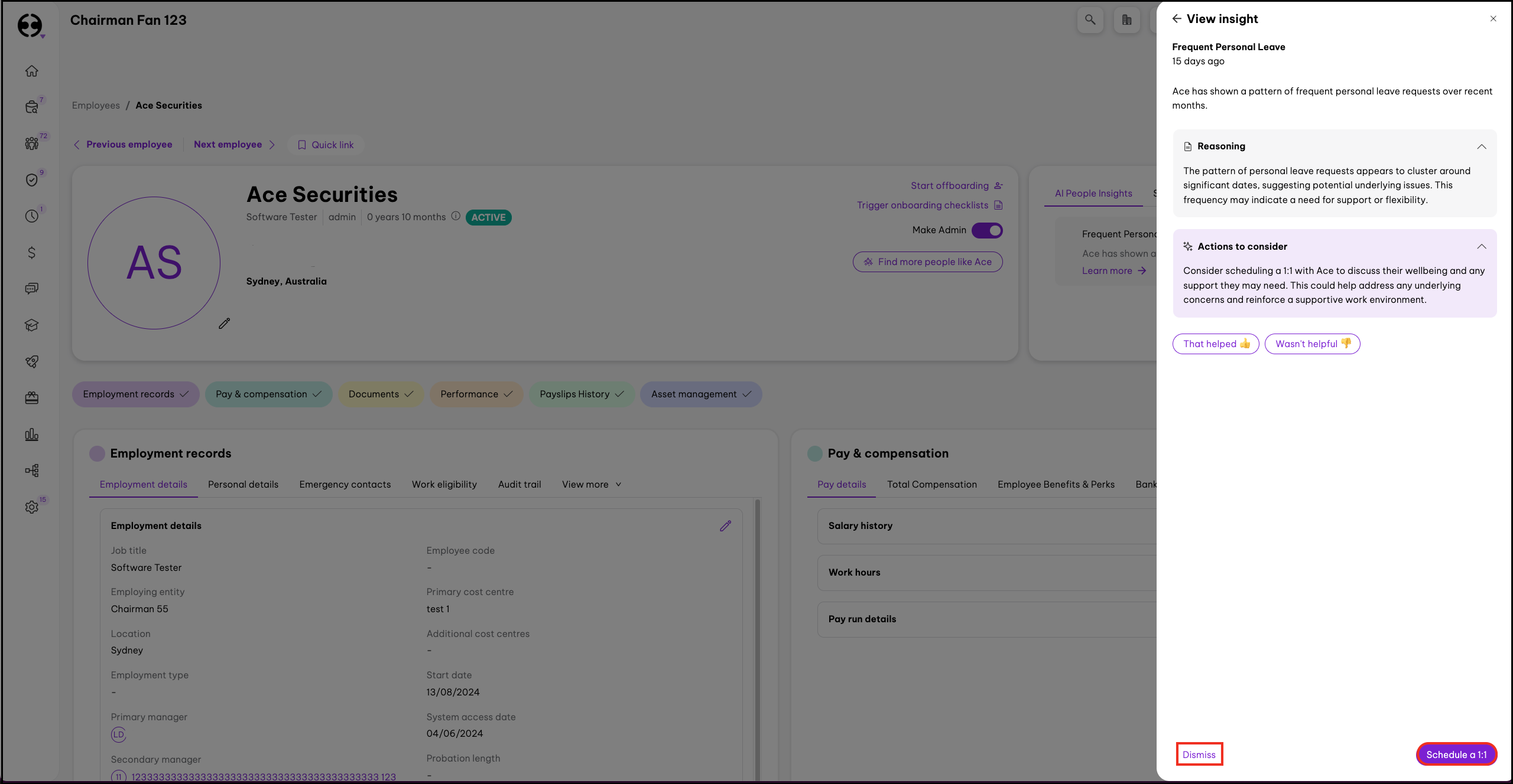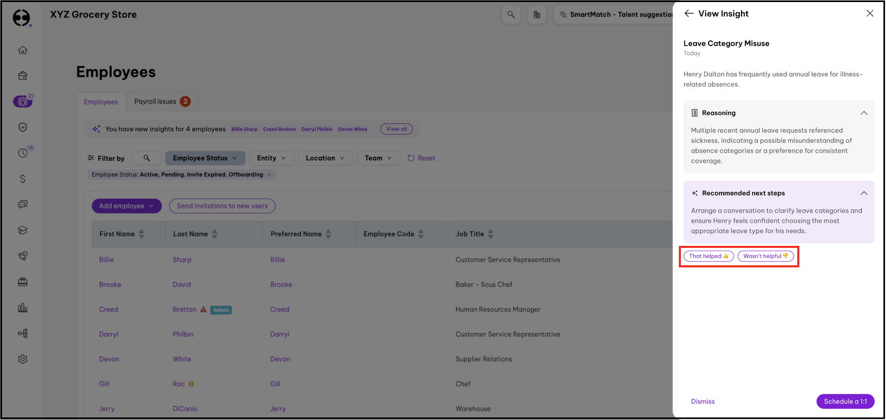 - Here you can read the detailed AI People Insight, and Employment Hero will suggest some follow up actions.