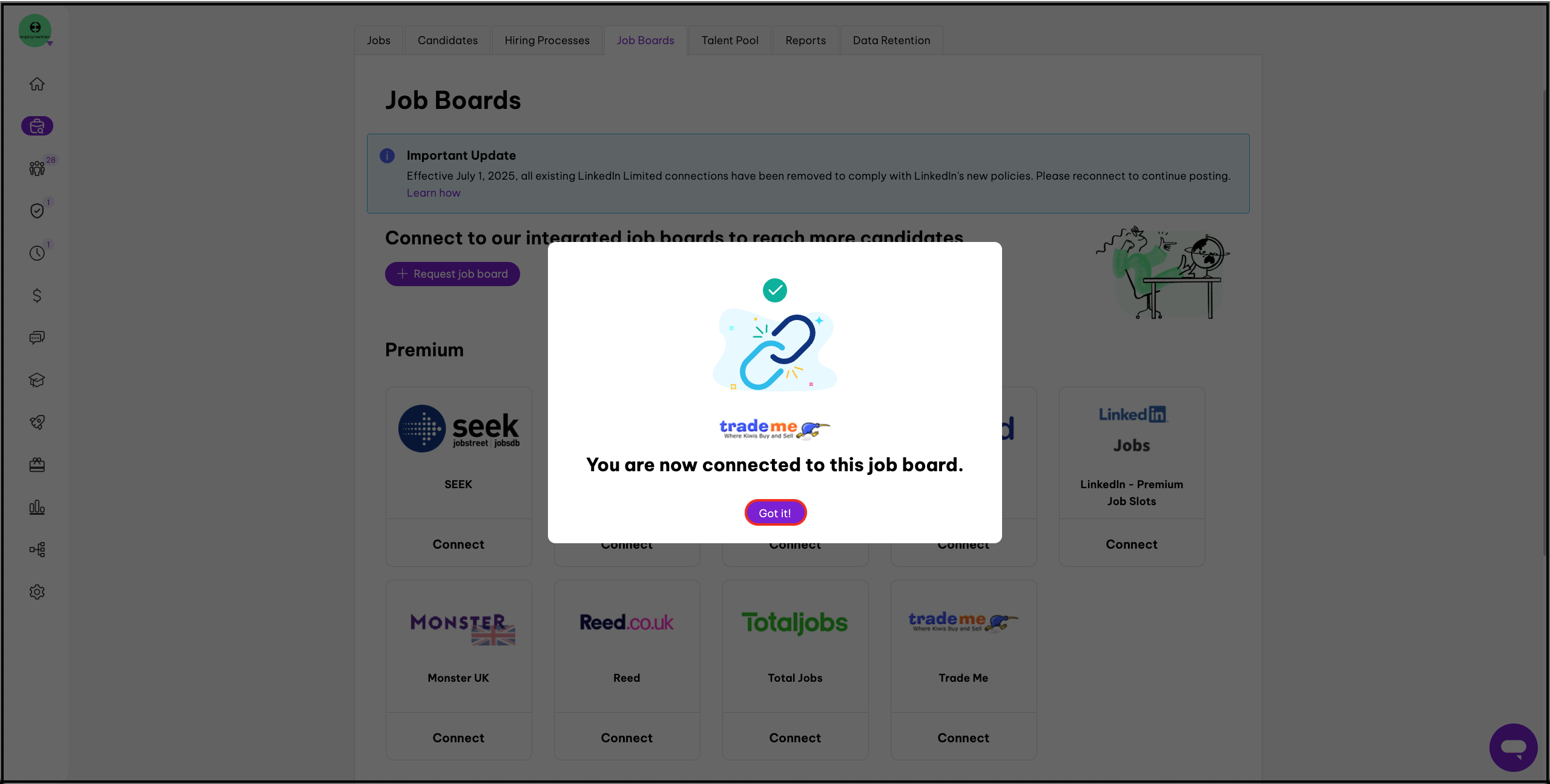 - You will now see You are connected to this job board. Click on Got it to remove the pop-up.